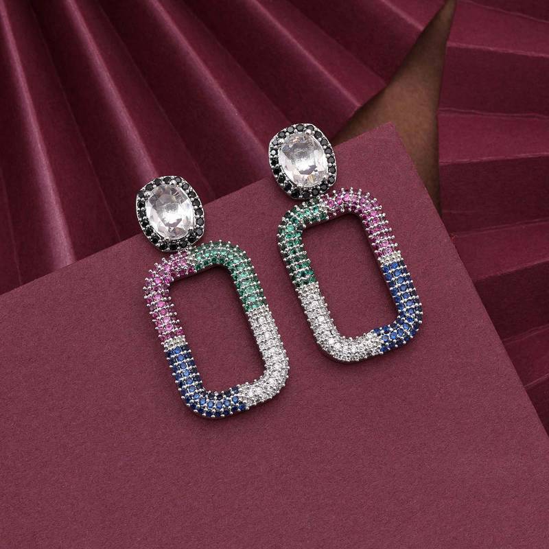 | Product Description | Earring Length: 4.00 Cm X Width: 1.70 Cm | Metal: Brass With Good Quality Silver Plated | Color: Multi | Stone: American Diamond | Gross Weight: 12.00 Grams | Package Content: 1 Pair Of Earrings | Back Finding: Post With Friction Back X Earring Style: Dangle |