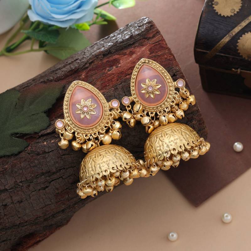 Earring Length: 7.80 Cm X Width: 4.00 Cm | Metal: Alloy With Good Quality Gold Plated | Color: Pink | Stone: Monalisa Stone | Gross Weight: 49.00 Grams | Package Content: 1 Pair Of Earrings | Back Finding: Post With Friction Back X Earring Style: Jhumka