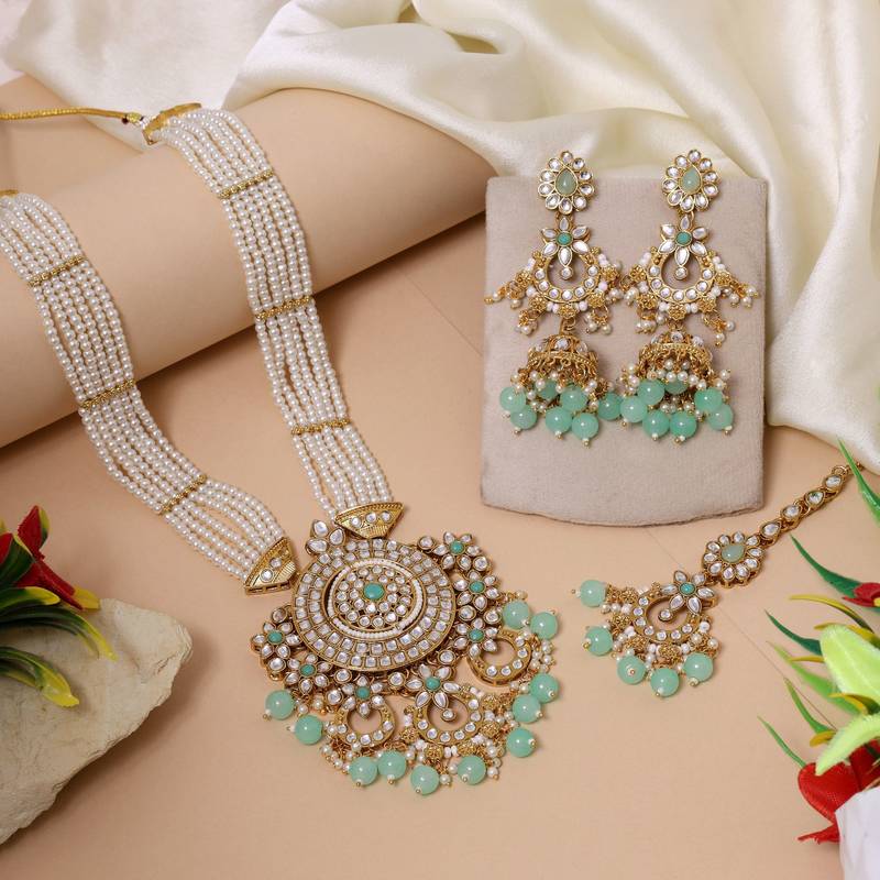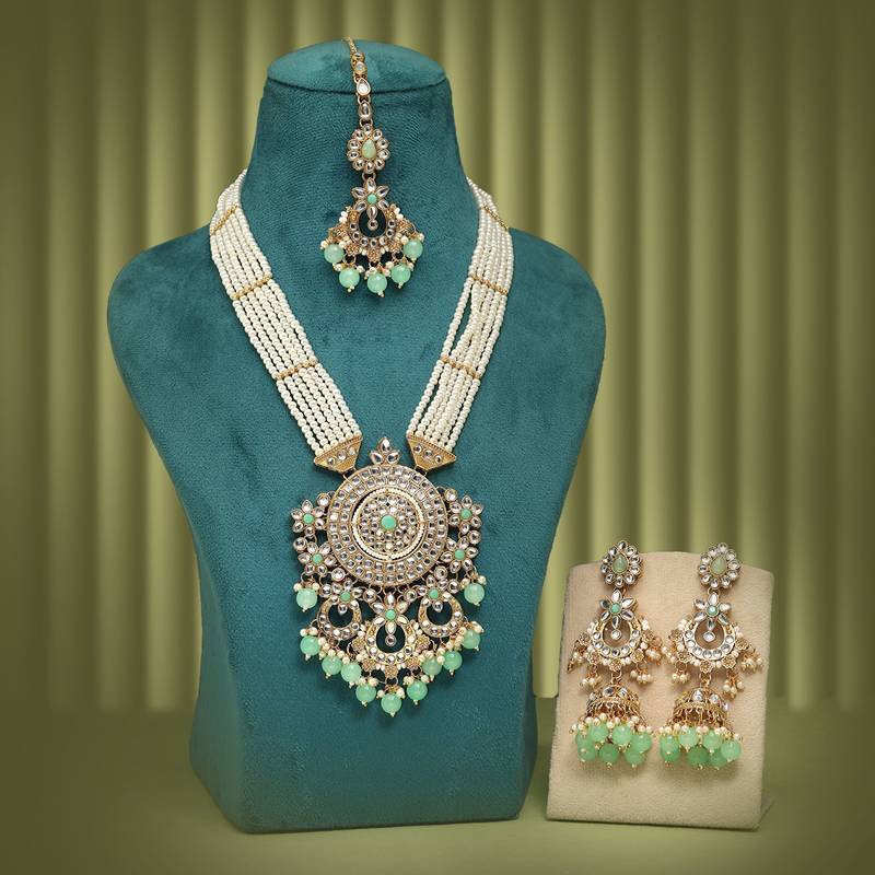 Product Description | Adjustable Rope | Necklace Length: 42.00 Cm X Width: 2.50 Cm | Pendant Length: 10.50 Cm X Width: 8.00 Cm | Earring Length: 9.00 Cm X Width: 2.50 Cm | Maang Tikka Length: 19.00 Cm X Width: 3.20 Cm | Metal: Alloy With Good Quality Gold Plated | Color: Pista Green | Stone: Kundan & Imitation Pearl | Gross Weight: 183.00 Grams | Package Content: 1 Piece Of Necklace/1 Pair Of Earring/1 Piece Of Maang Tikka | Back Finding: Post With Friction Back X Earring Style: Jhumka |
