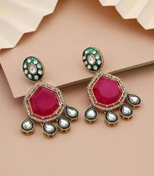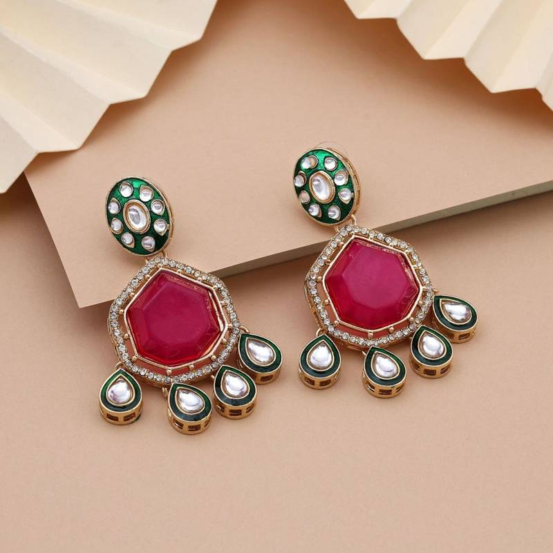 Earring Length: 6.00 Cm X Width: 2.70 Cm | Metal: Alloy With Good Quality Gold Plated | Color: Rani | Stone: Kundan | Gross Weight: 32.00 Grams | Package Content: 1 Pair Of Earring | Back Finding: Post With Friction Back X Earring Style: Dangle