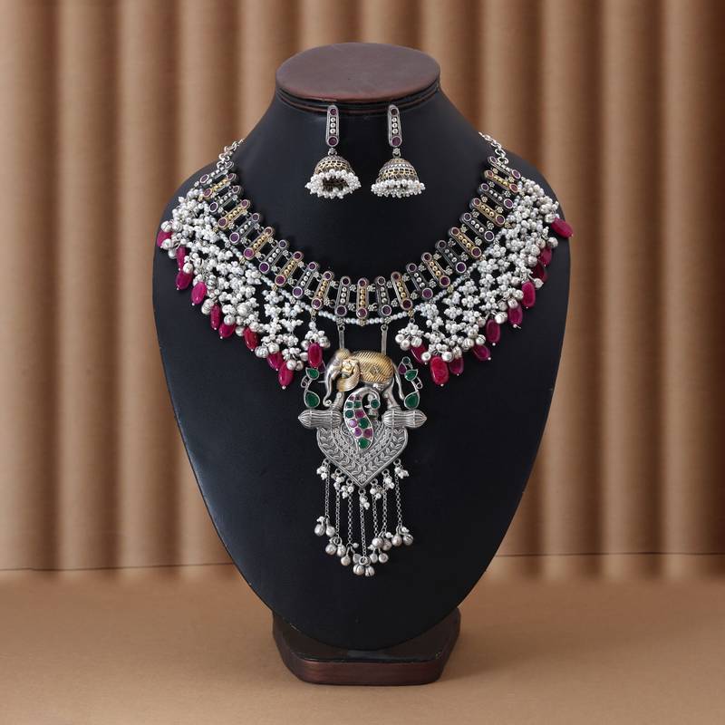 Rani & green color dual tone oxidised necklace set offering regal tones with ornate craftsmanship