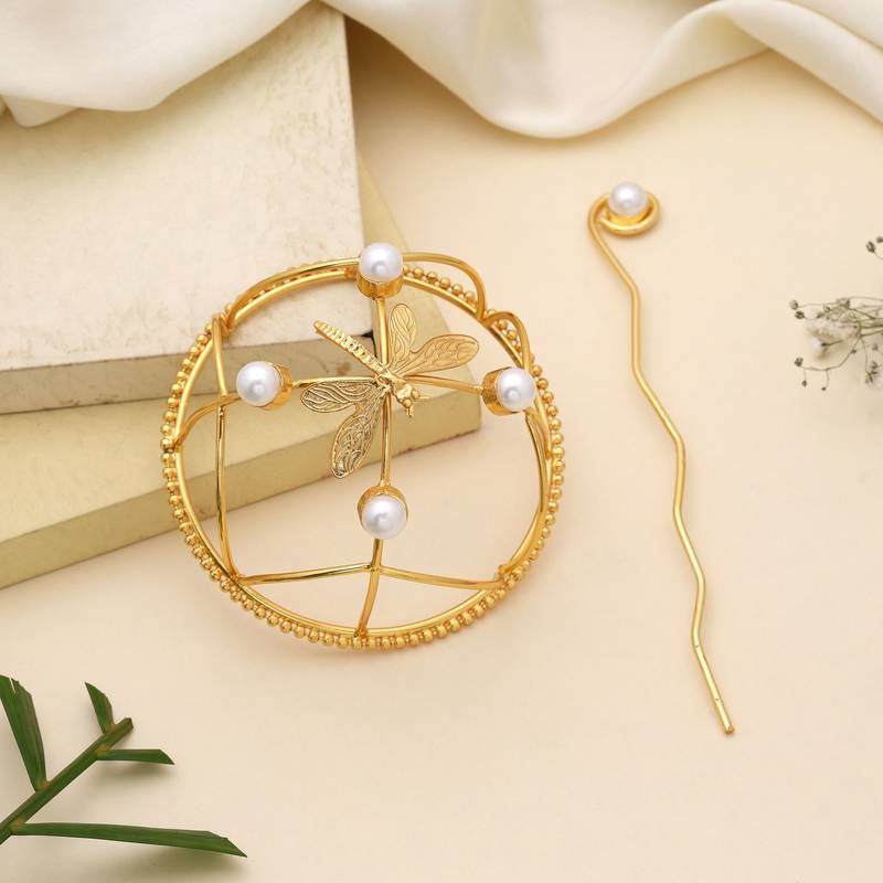 Hair Pin Length: 14.80 Cm X Width: 9.30 Cm X Hight: 6.00 Cm | Metal: Brass With Good Quality Gold Plated | Color: Gold | Stone: Imitation Pearl | Gross Weight: 58.00 Grams | Package Content: 1 Piece Of Hair Pin