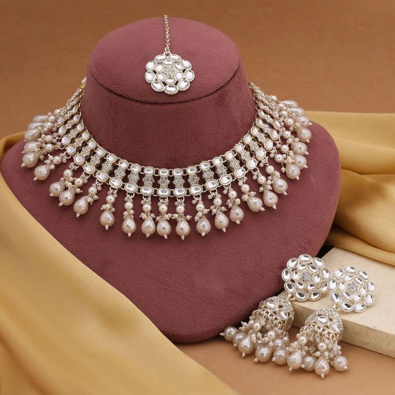 Product Description | Adjustable Rope | Necklace Length: 22.00 Cm X Width: 4.50 Cm | Earring Length: 8.30 Cm X Width: 2.50 Cm | Maang Tikka Length: 12.00 Cm X Width: 3.00 Cm | Metal: Alloy With Good Quality Gold Plated | Color: White | Stone: Kundan & Imitation Pearl | Gross Weight: 141.00 Grams | Package Content: 1 Piece Of Necklace/1 Pair Of Earring/1 Piece Of Maang Tikka | Back Finding: Post With Friction Back X Earring Style: Jhumka |
