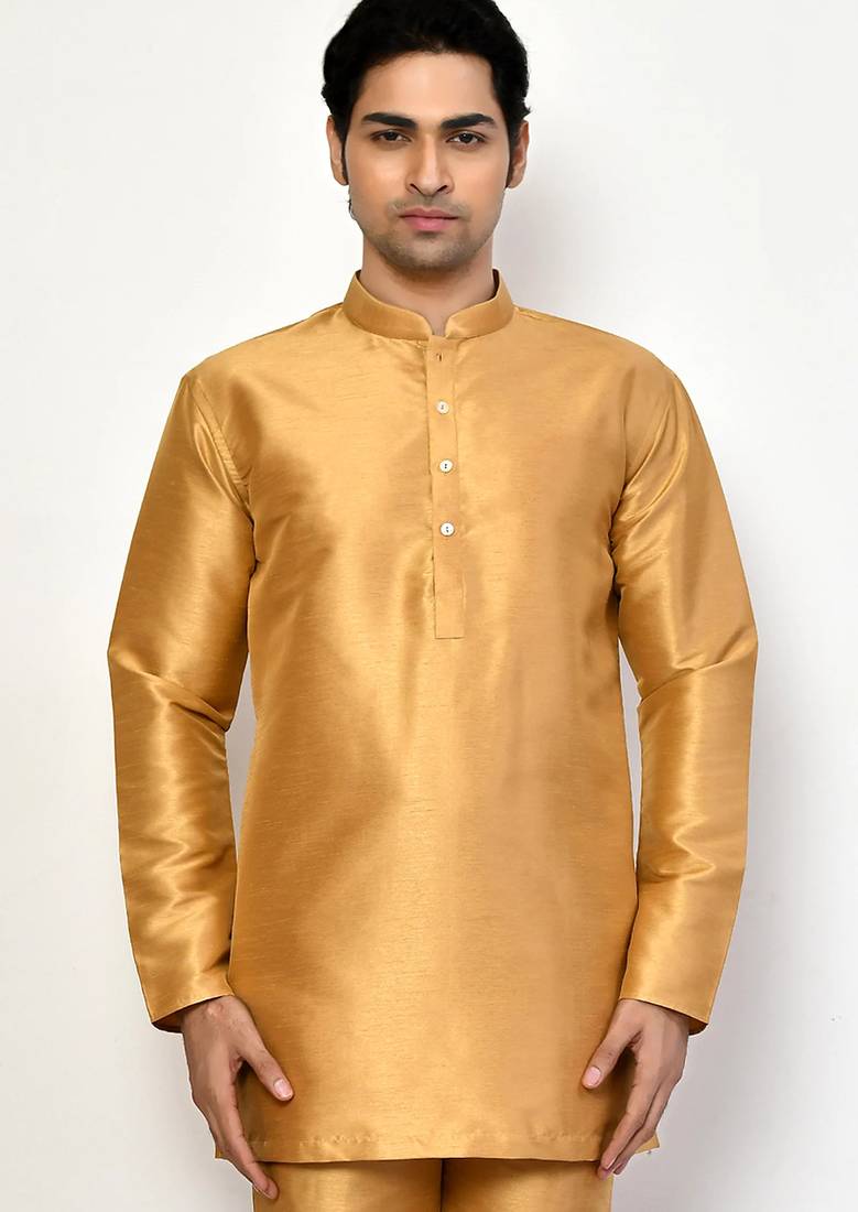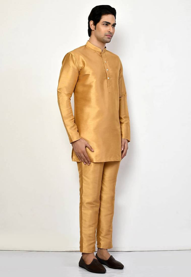| Product Description | Upgrade Your Ethnic Style With This Elegant Gold Raw Silk Short Kurta Paired With Matching Pants, Designed For Special Occasions And Festive Celebrations. Made From Premium Raw Silk Fabric, It Offers A Rich Texture, Refined Finish, And Comfortable Fit. Perfect For Weddings, Parties, Festive Events, And Traditional Gatherings. |