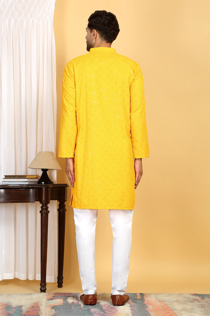 Yellow embroidered kurta set with sequins highlights
