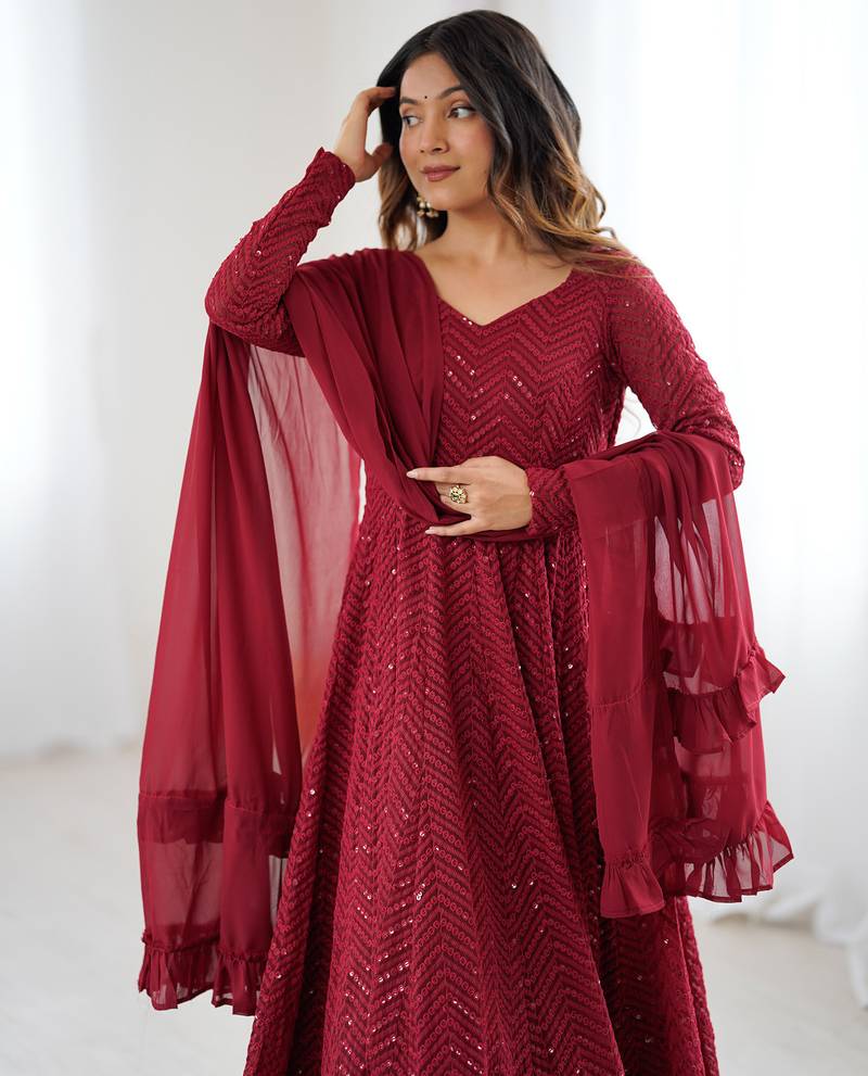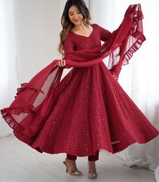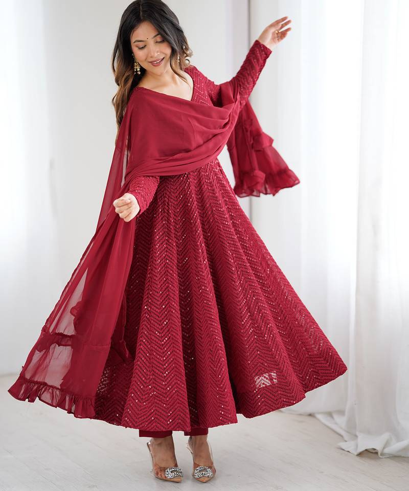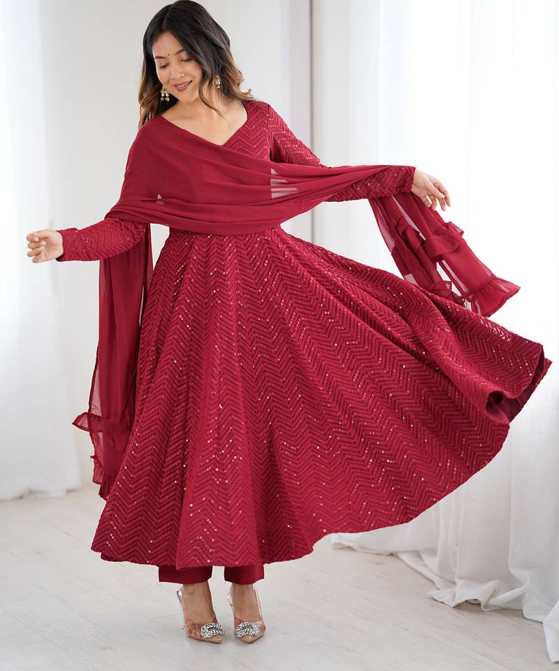 Designer georgette embroidery and lakhnowi sequence maroon readymade salwar suit stitched