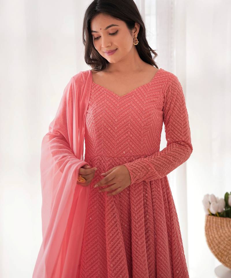 Designer georgette embroidery and lakhnowi sequence peach readymade salwar suit stitched