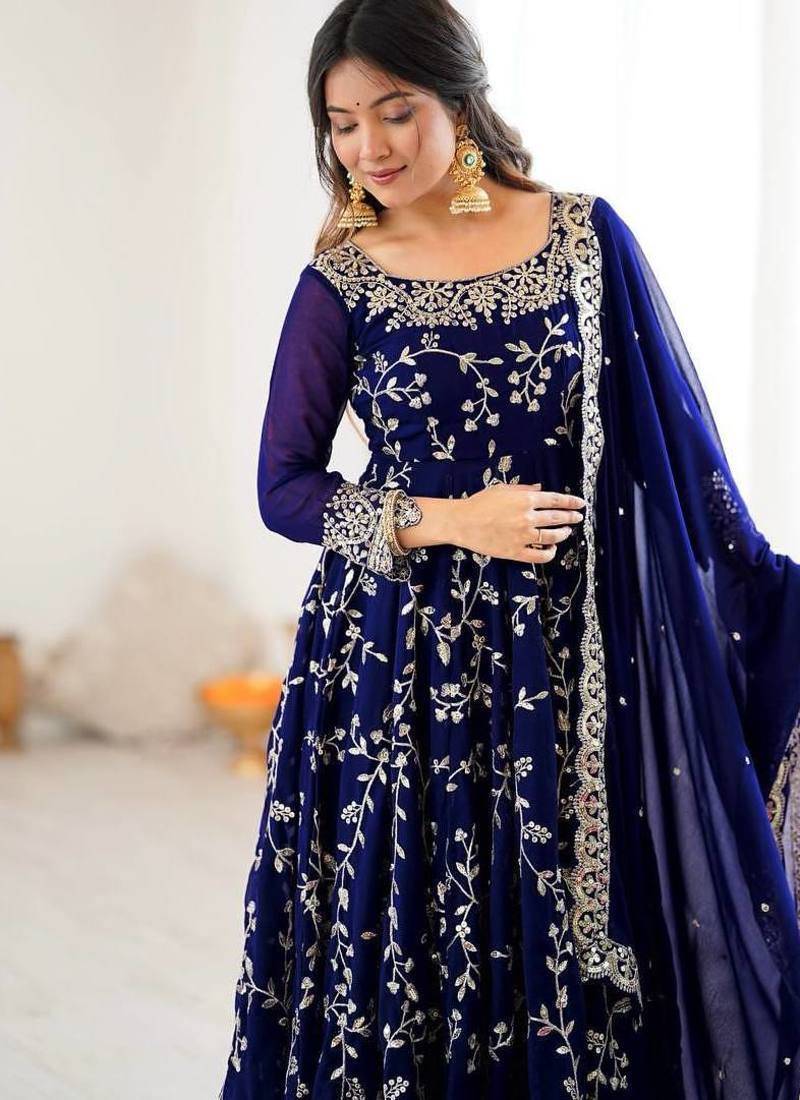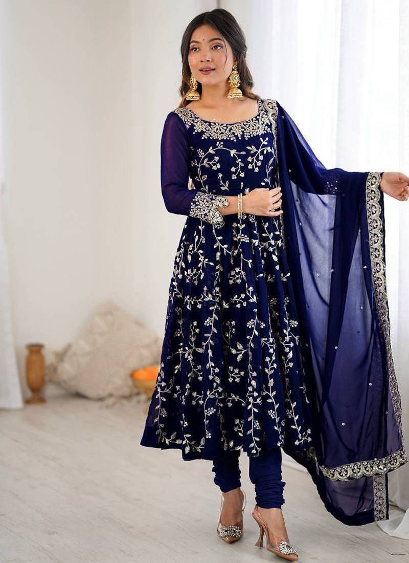 Product Name Desinger Faux Georgette Embroidery And Sequence Work Navy Blue Readymade Salwar Suit