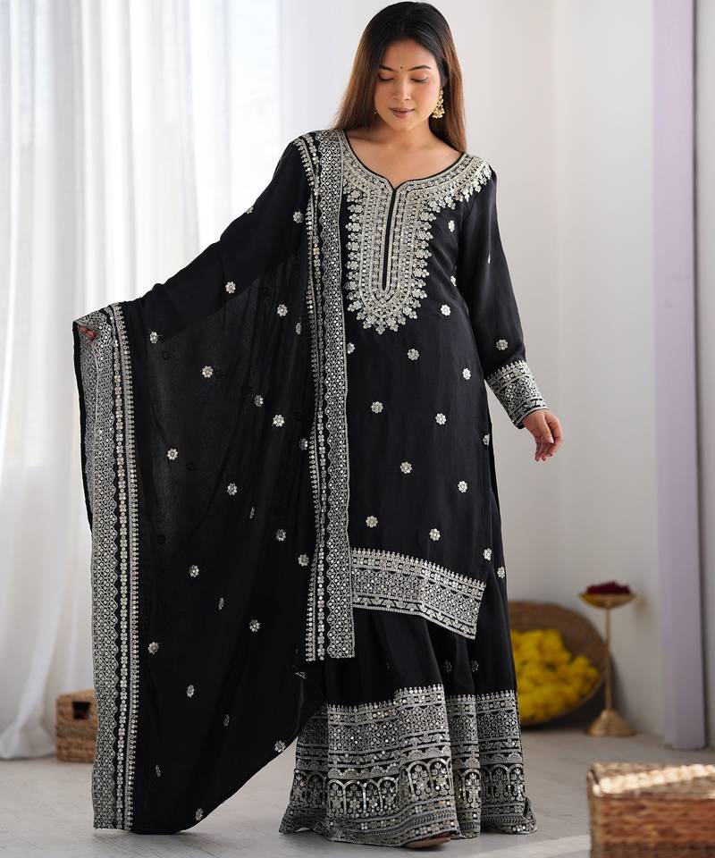 Heavy chinon silk embroidery and sequence work black readymade salwar suit stitched