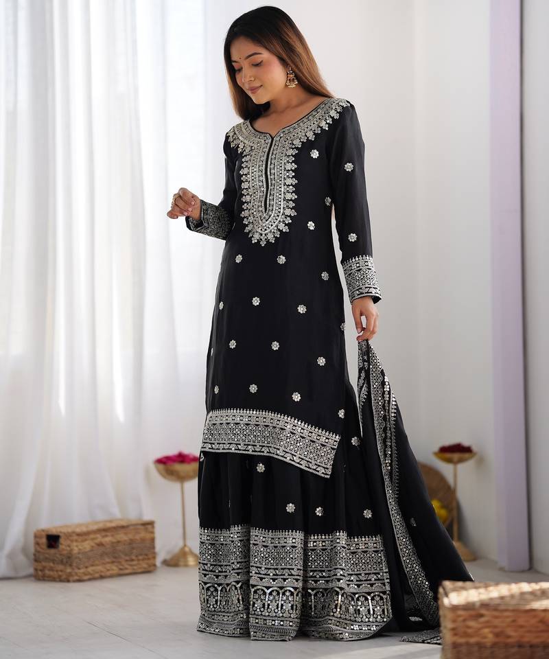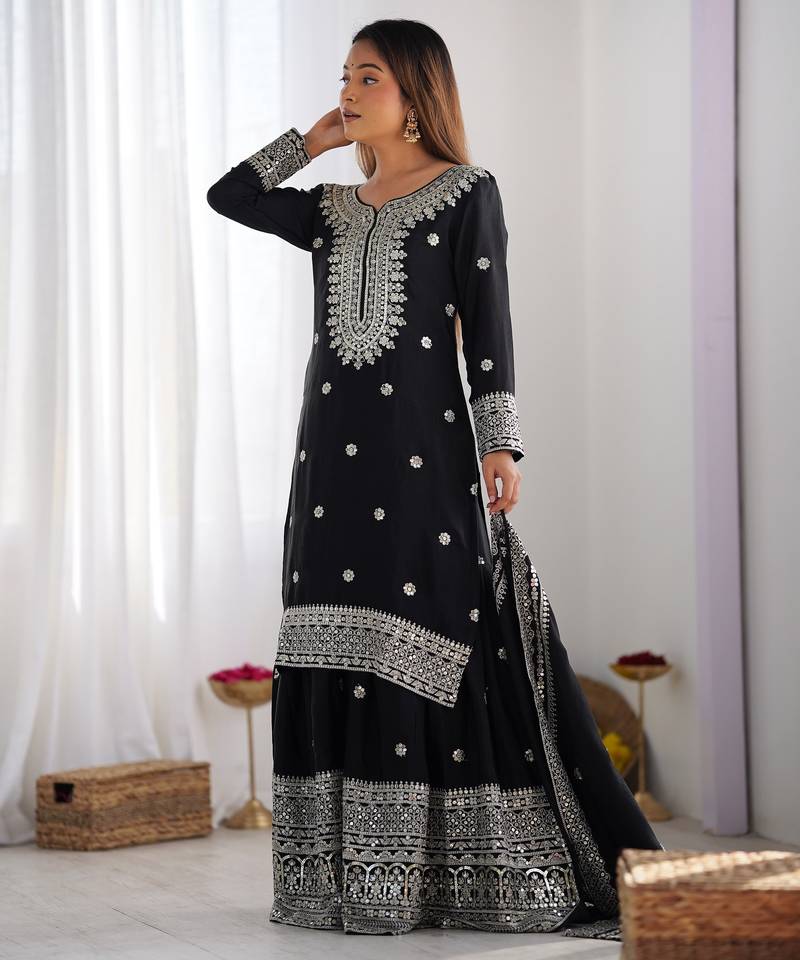 Product Name Heavy Chinon Silk Embroidery And Sequence Work Black Readymade Salwar Suit