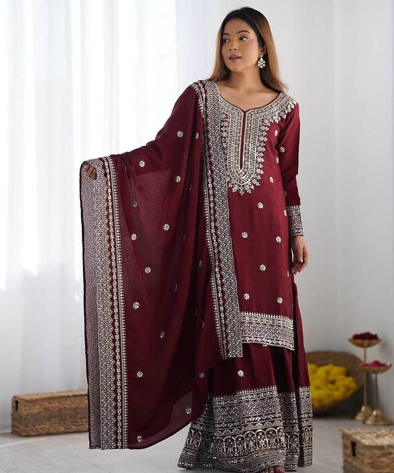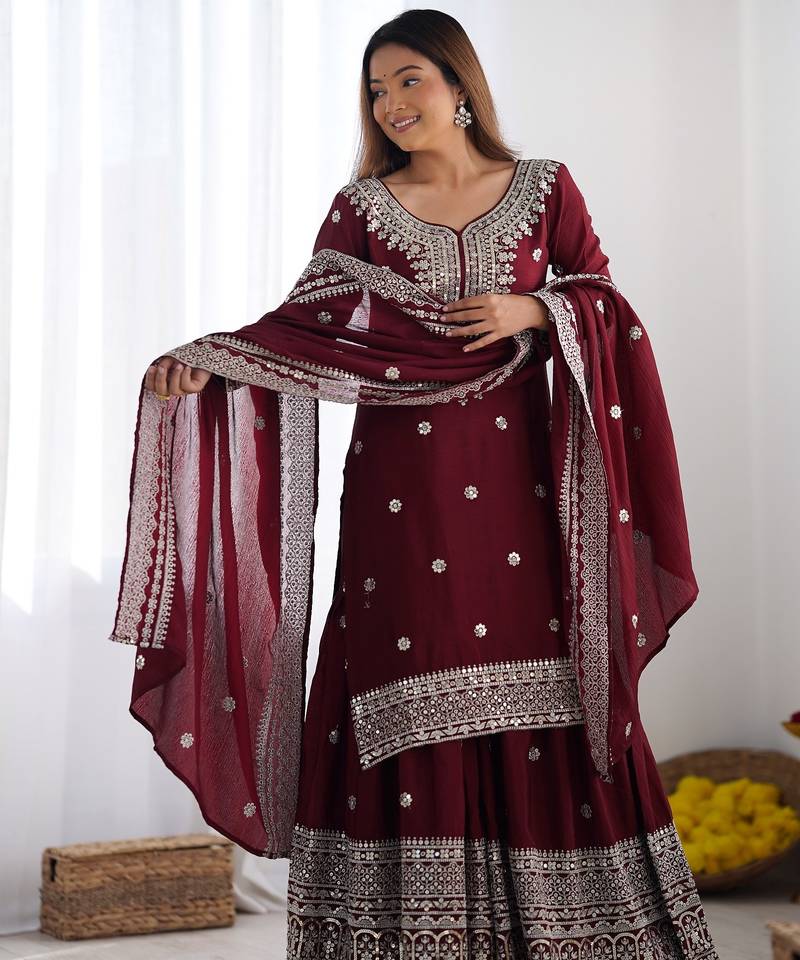 Product Name Heavy Chinon Silk Embroidery And Sequence Work Maroon Readymade Salwar Suit