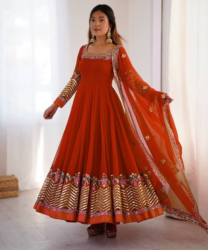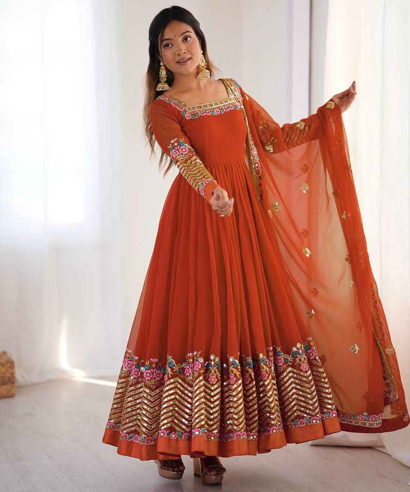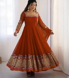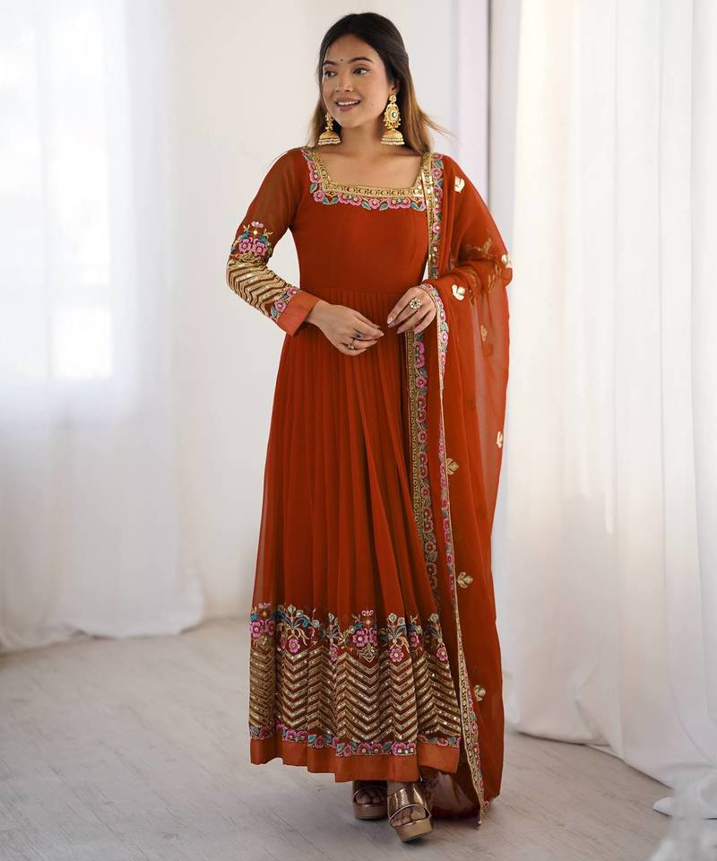 Heavy faux georgette embroidery work rust readymade gown stitched