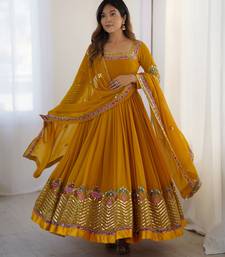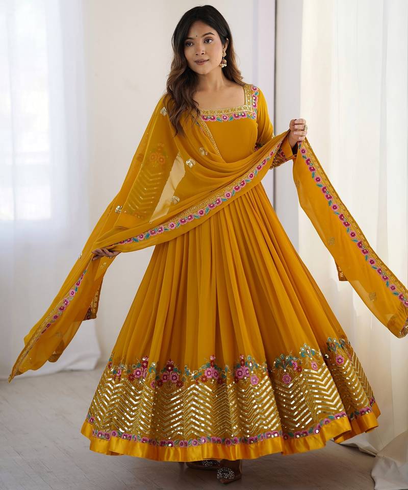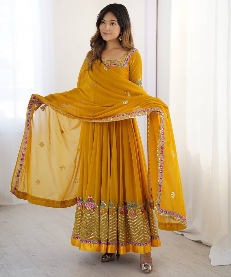 | Product Name | Heavy Faux Georgette Embroidery Work Yellow Readymade Gown | |