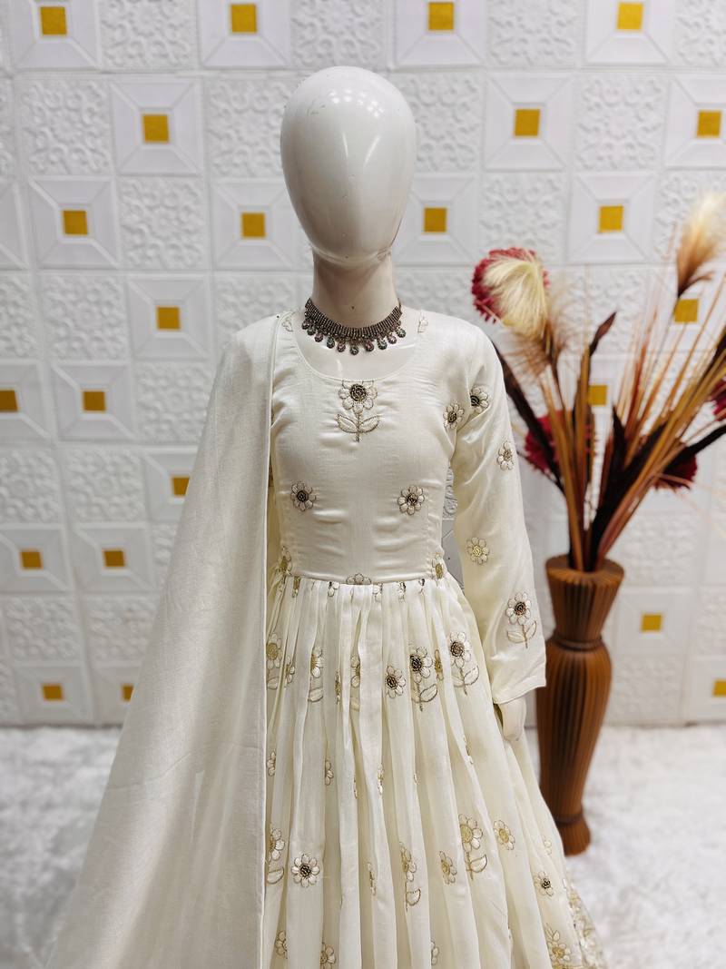 Heavy vichitra silk embrodairy seqence work white readymade ethnic gown