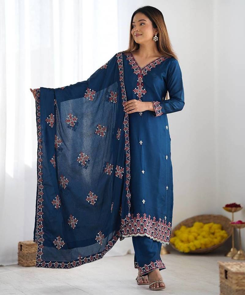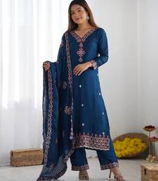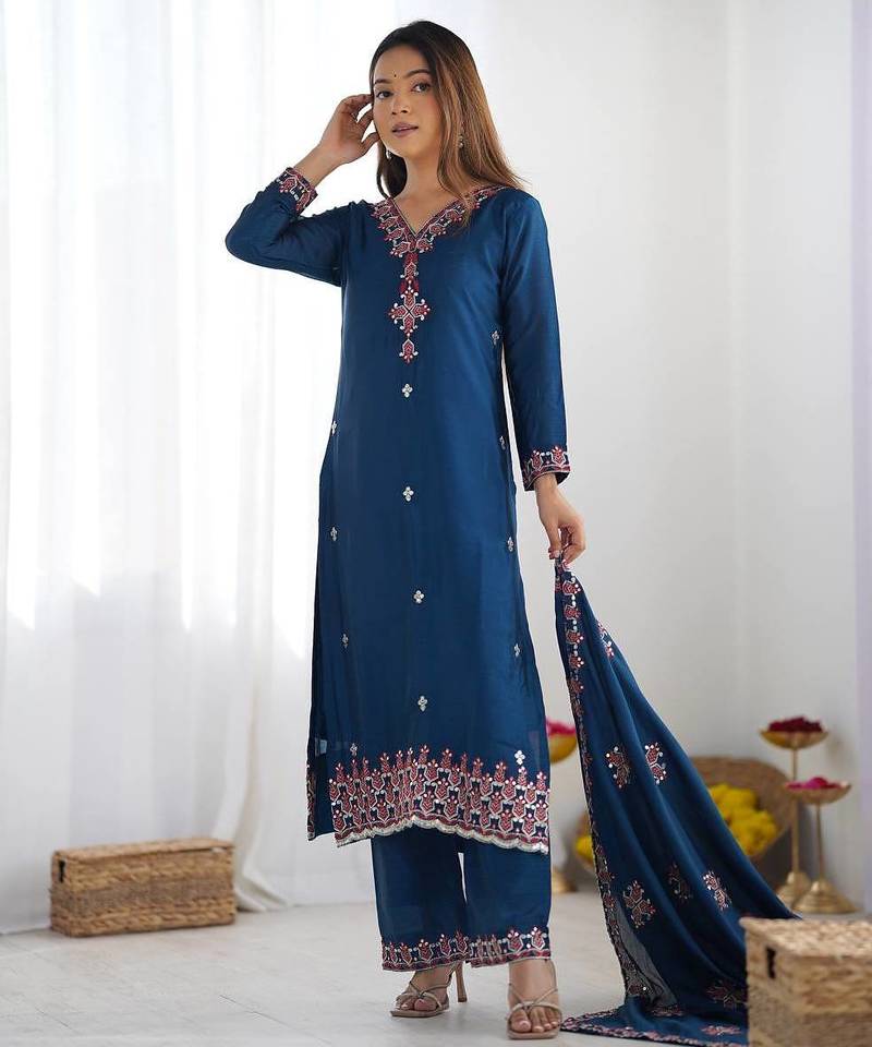 Premium heavy chinon silk embroidery and sequence work teal blue readymade salwar suit stitched
