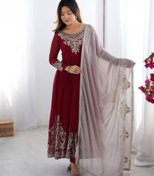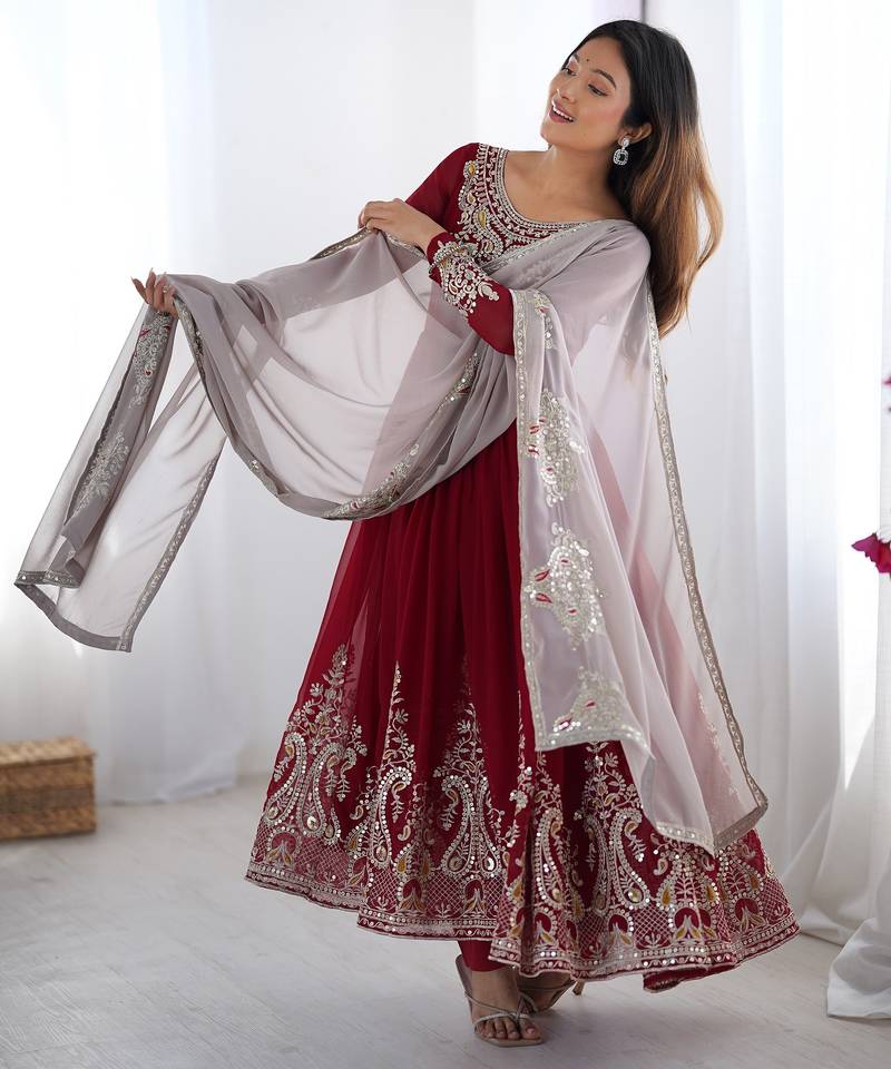 Trendy heavy georgette embroidery work maroon readymade gown stitched