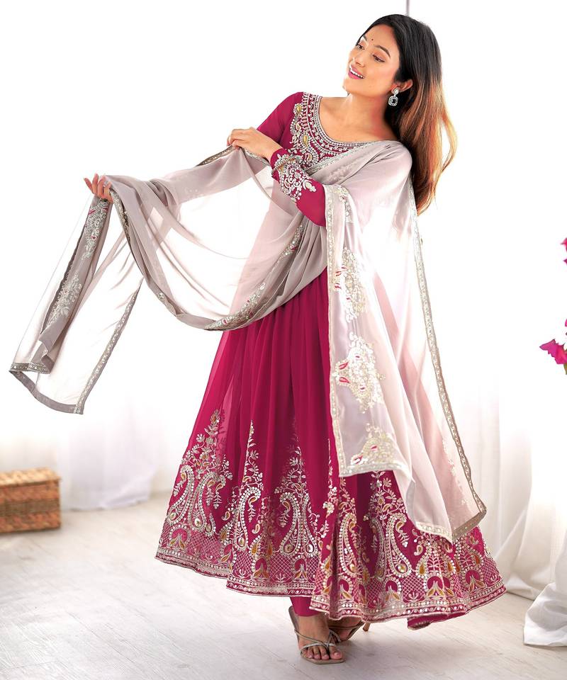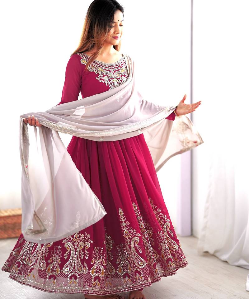 Trendy heavy georgette embroidery work rani-pink readymade gown stitched