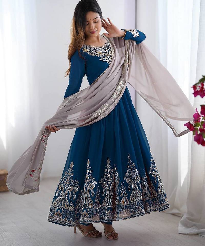 Trendy heavy georgette embroidery work teal-blue readymade gown stitched
