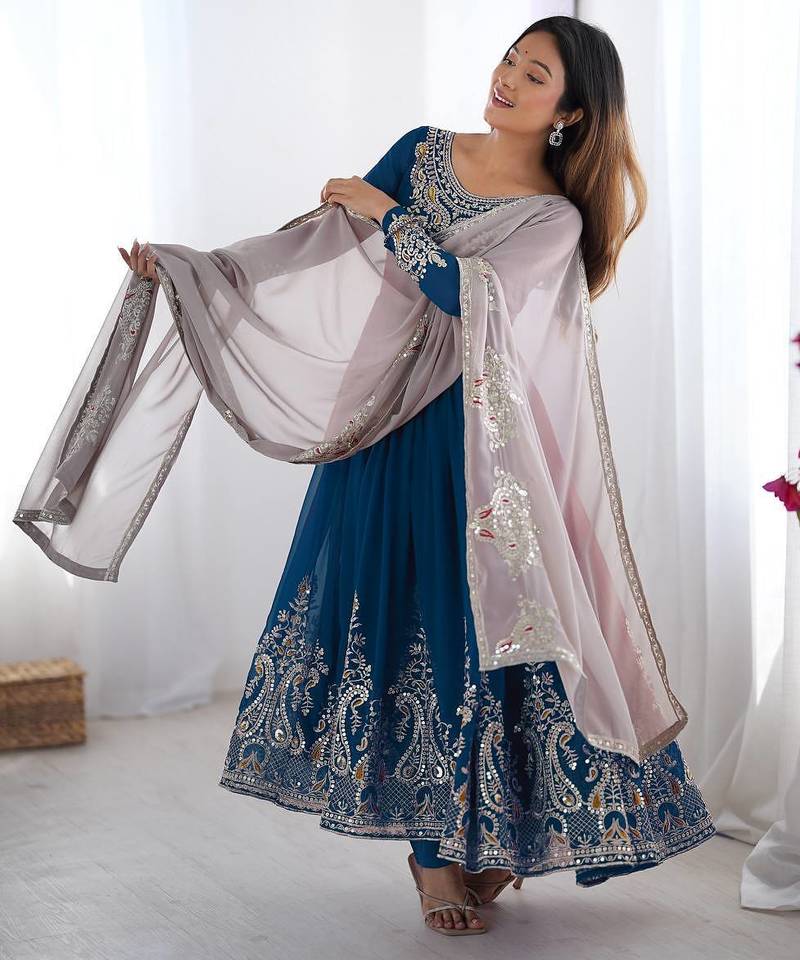 | Product Name | Trendy Heavy Georgette Embroidery Work Teal Blue Readymade Gown | |