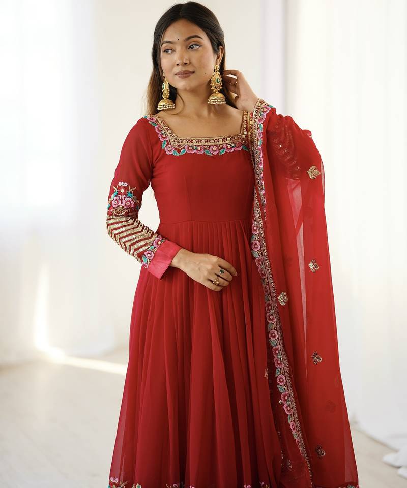 | Product Description | Gown Fabric : Heavy Georgette, Pant :Cotton, Work :Embroidery Work, Dupatta Fabric: Georgette, Stitch : Full Stitched With Elastic Bottom |