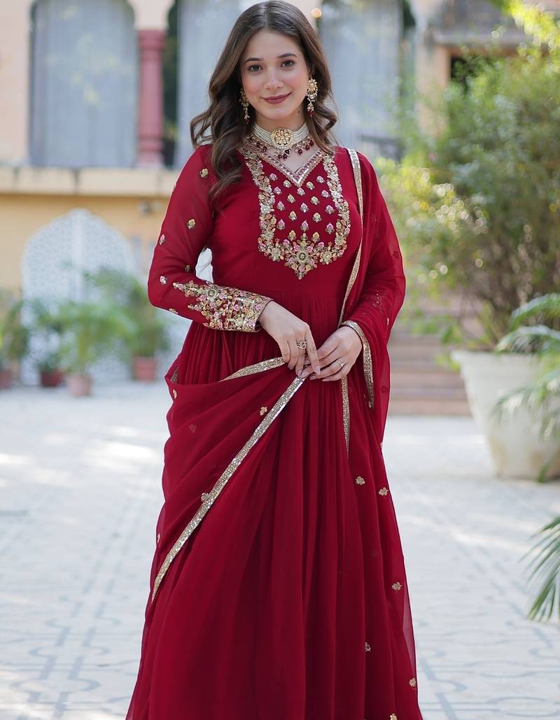 | Product Description | Maroon Anarkali Suit In Pure Georgette With Intricate Embroidery And Georgette Dupatta. |