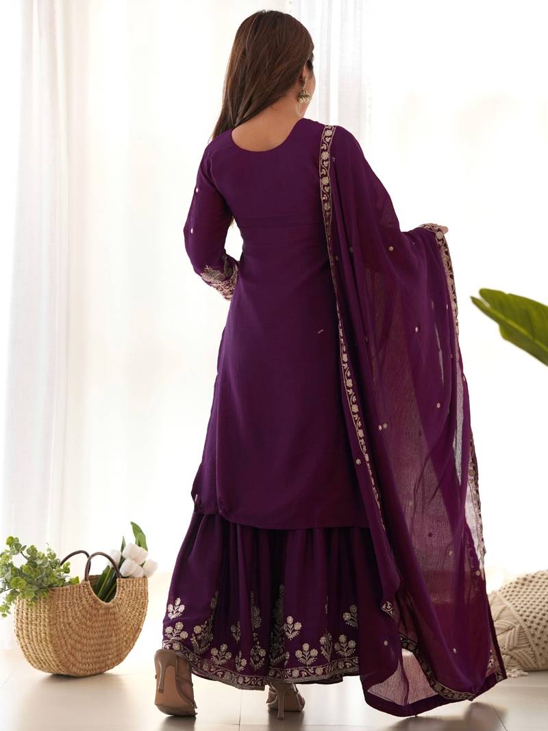 | Product Name | Plum Purple Chinon Silk Sharara Suit With Zari Sequins Embroidery And Chinon Dupatta | |