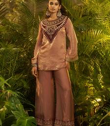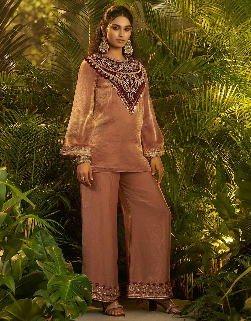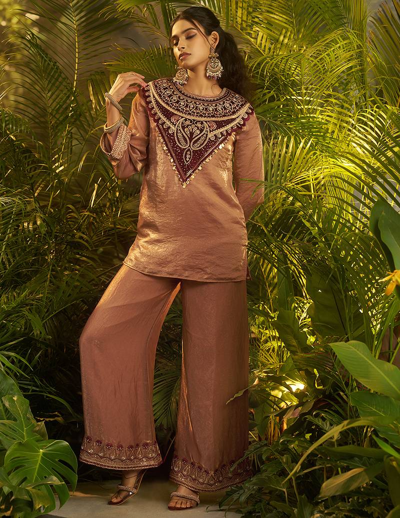 | Product Description | Brown Fendi Kurta Set Featuring A Rich Maroon Velvet Yoke Adorned With Heavy Zari, Sequins, Beads, And Thread Embroidery, Paired With Wide Leg Pants With Embroidered Hem. |