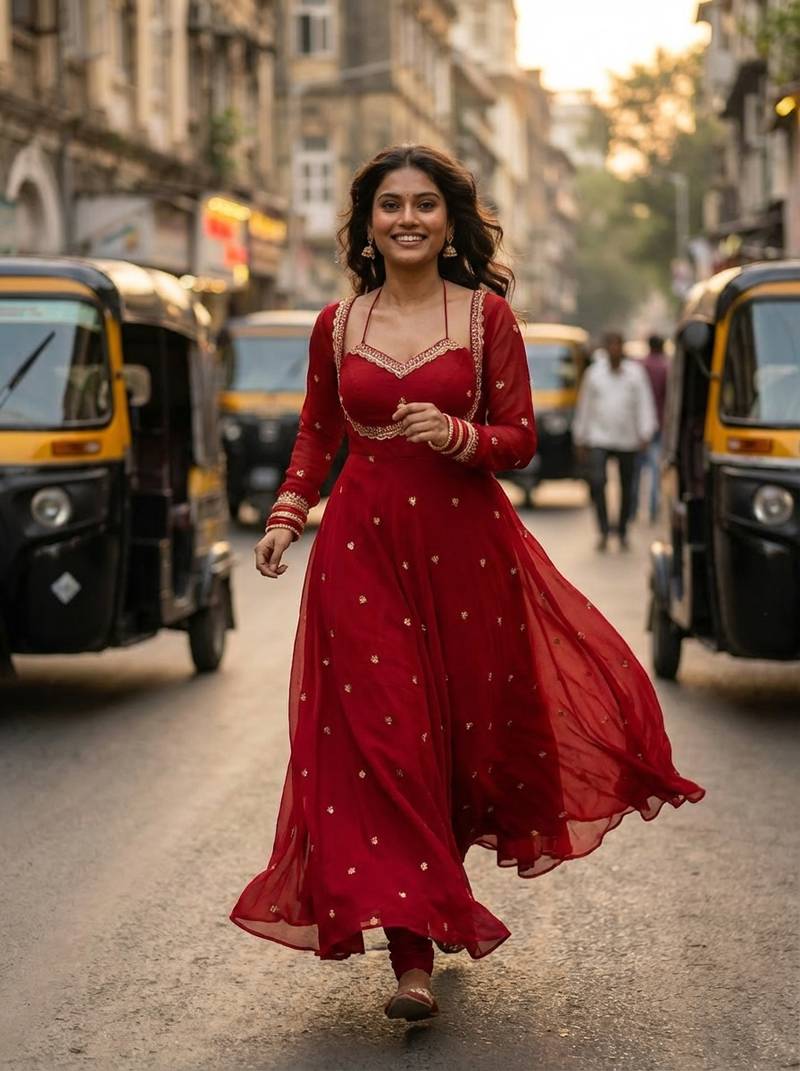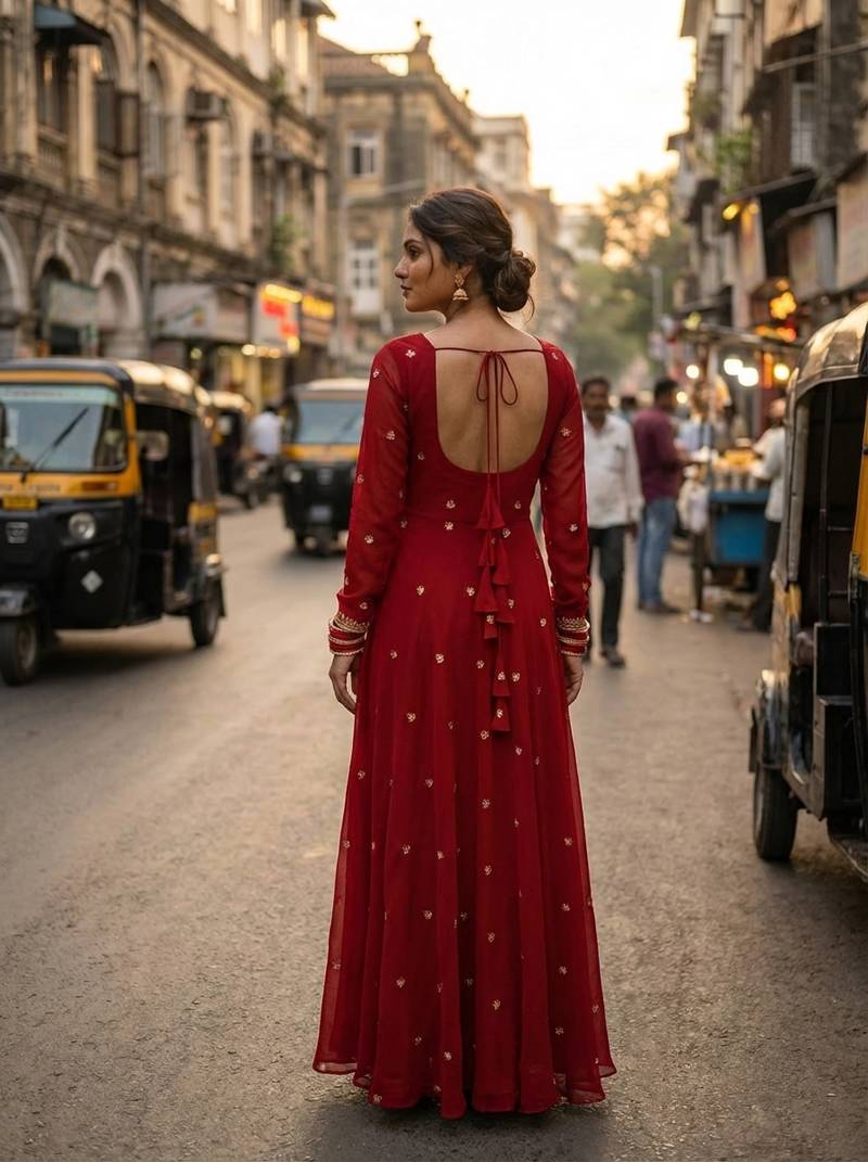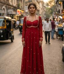 | Product Description | Elegant Red Georgette Gown Featuring Delicate Zari Embroidery, A Sweetheart Neckline, Long Sleeves, And A Graceful 4.5+ Meter Flare, Finished With Full Micro Cotton Lining For Comfort. |