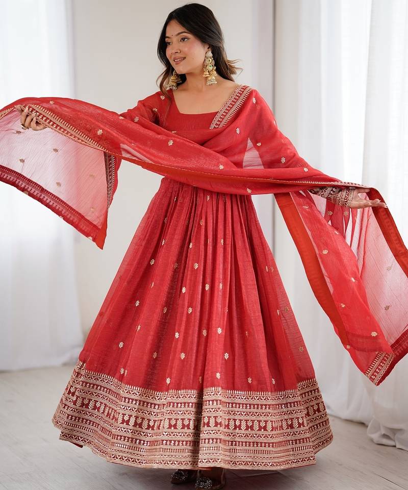 Rust embroidered anarkali with dupatta stitched
