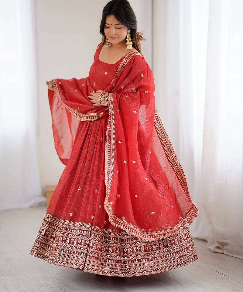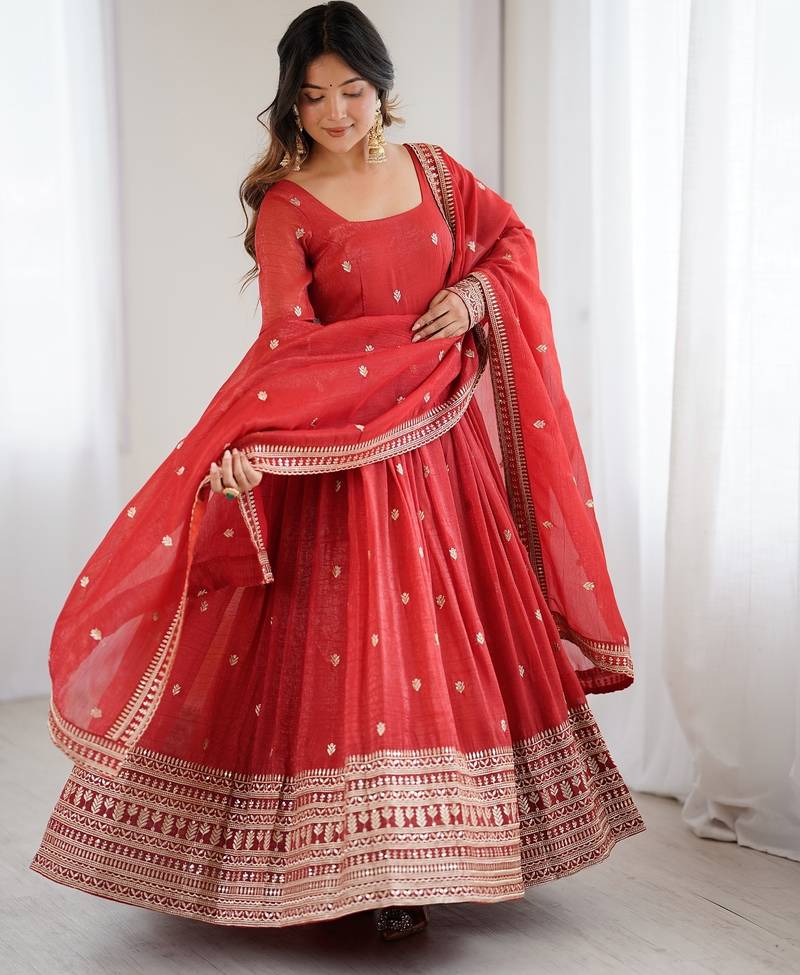 | Product Description | Rust Crunchy Silk Anarkali With 3m Flair, Embroidered Sequin Jari Sleeves, Fancy Tassels, Side Zipper, And 2.2m Embellished Dupatta With Full Micro Scrape Lining. |