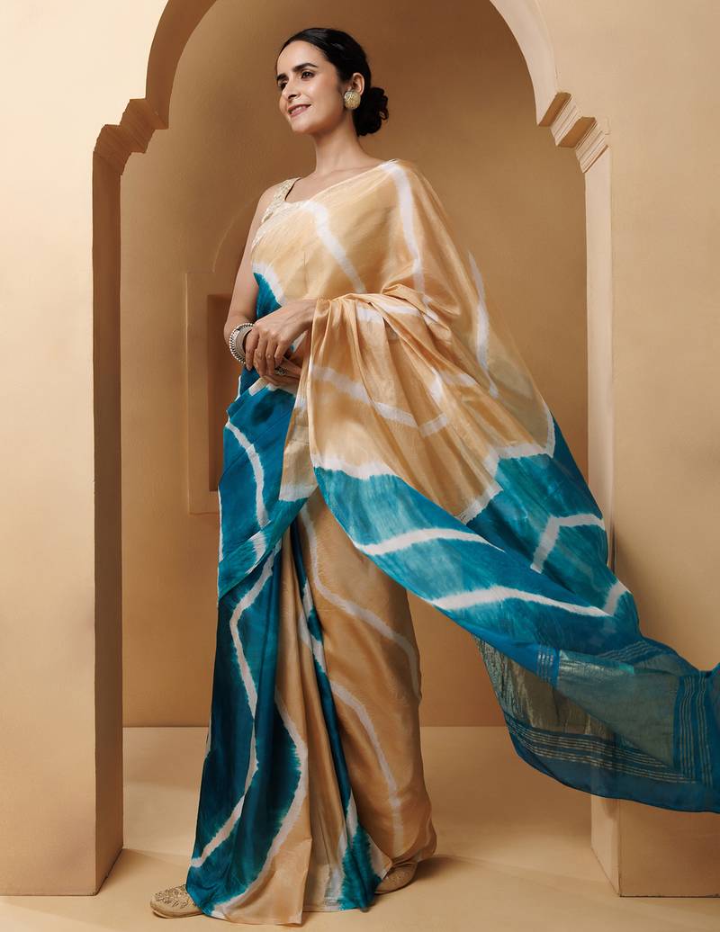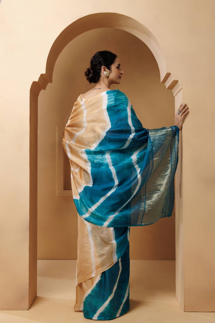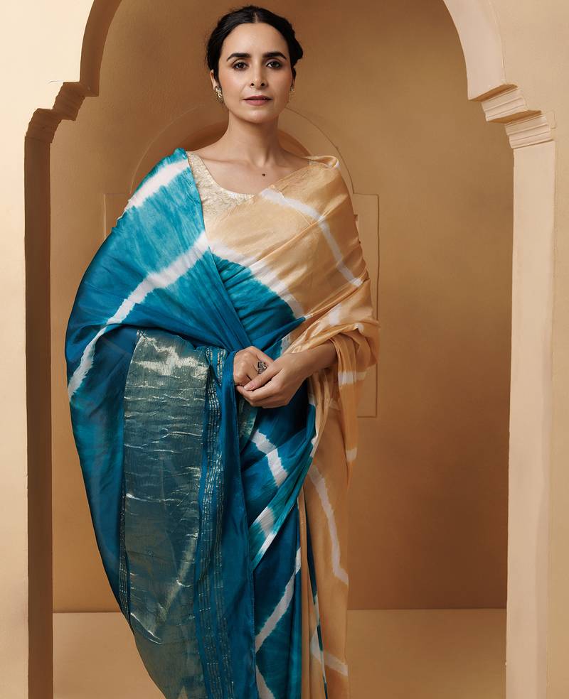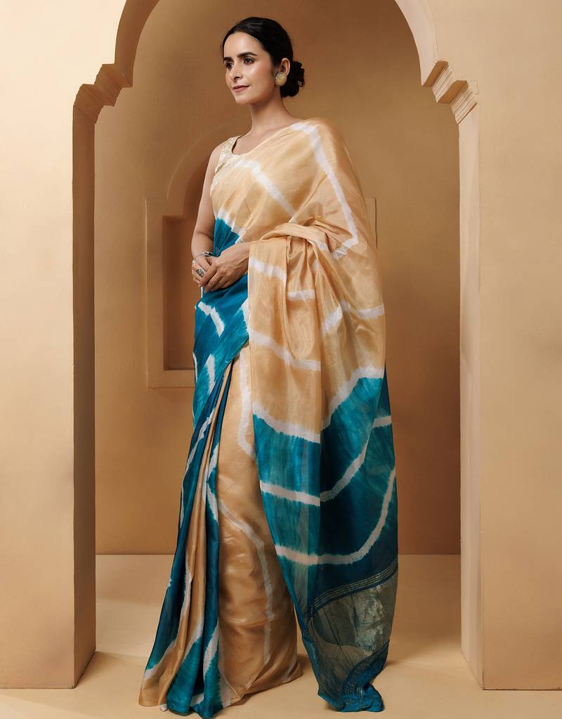 | Product Name | Beige Turquoise Tabby Silk Hand Dyed Leheriya Saree | |