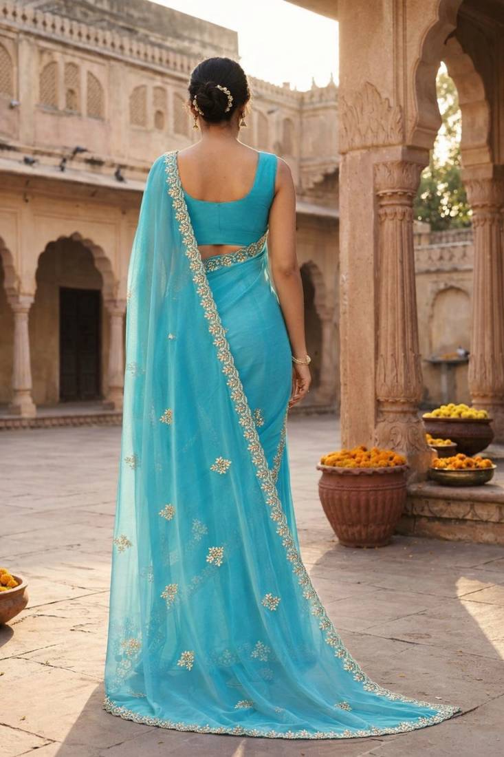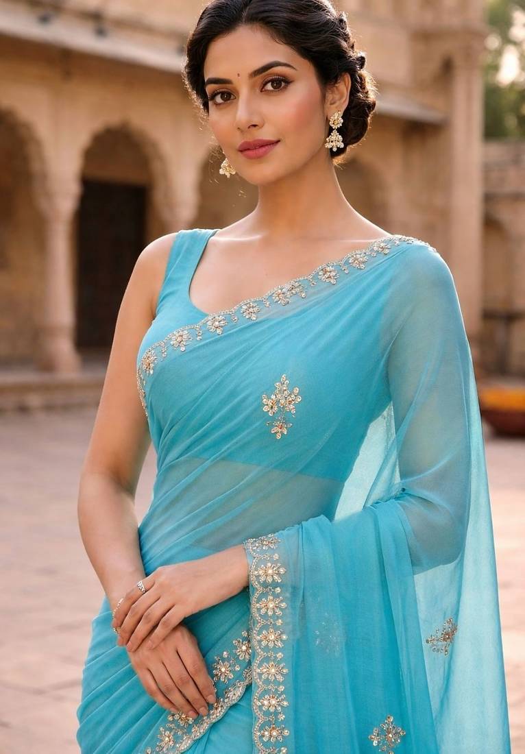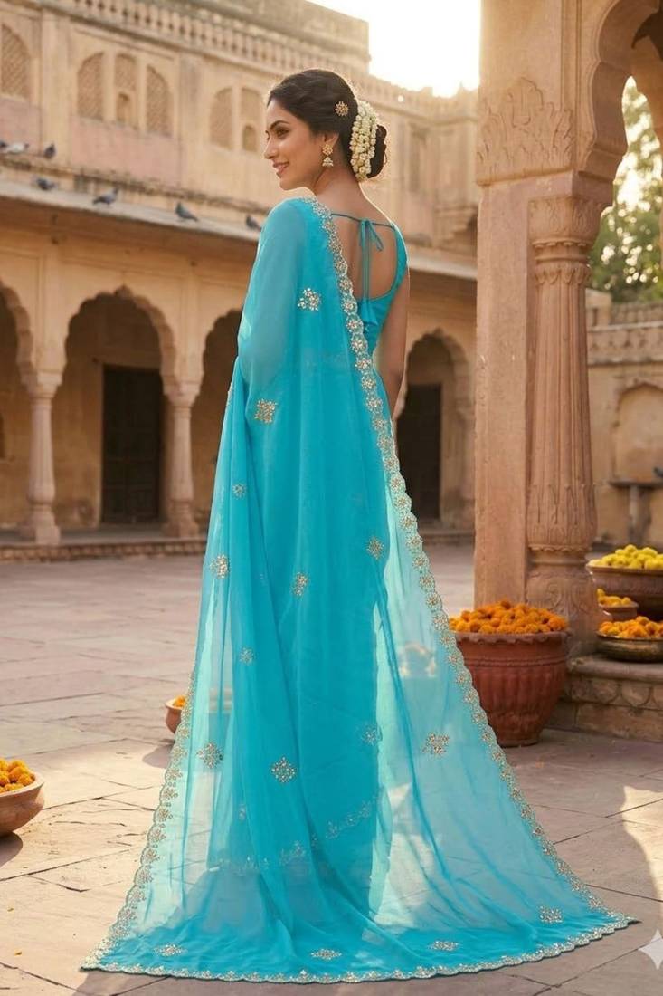 | Product Description | Elegant And Graceful, This Blue Chiffon Saree Is Adorned With Intricate Gotta Patti And Kardana Work. The Beautifully Designed Scallop Border Enhances Its Festive Appeal, While The Lightweight Chiffon Fabric Ensures A Soft And Flowy Drape. Perfect For Festive Occasions, Parties, And Traditional Celebrations. Comes With A Matching Unstitched Blouse Piece For Customized Styling. |
