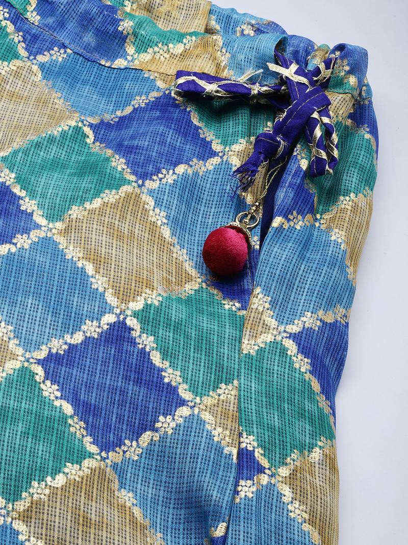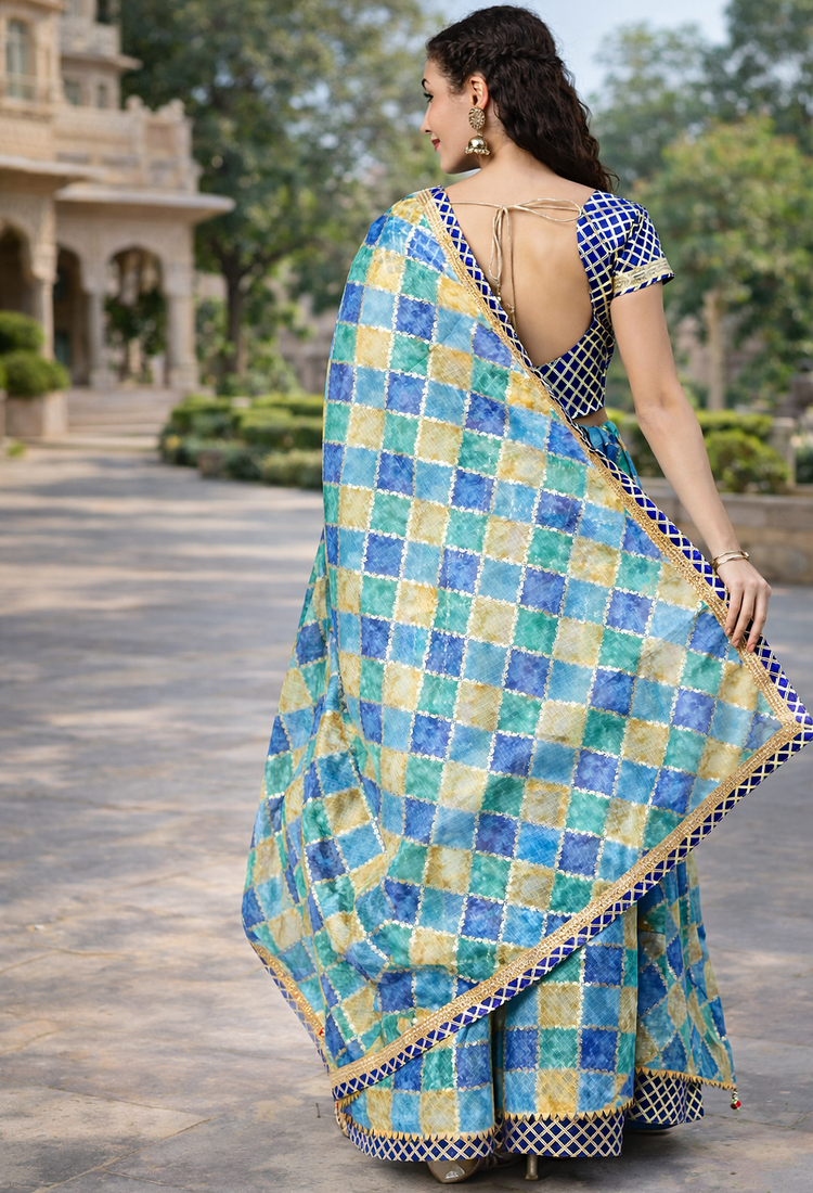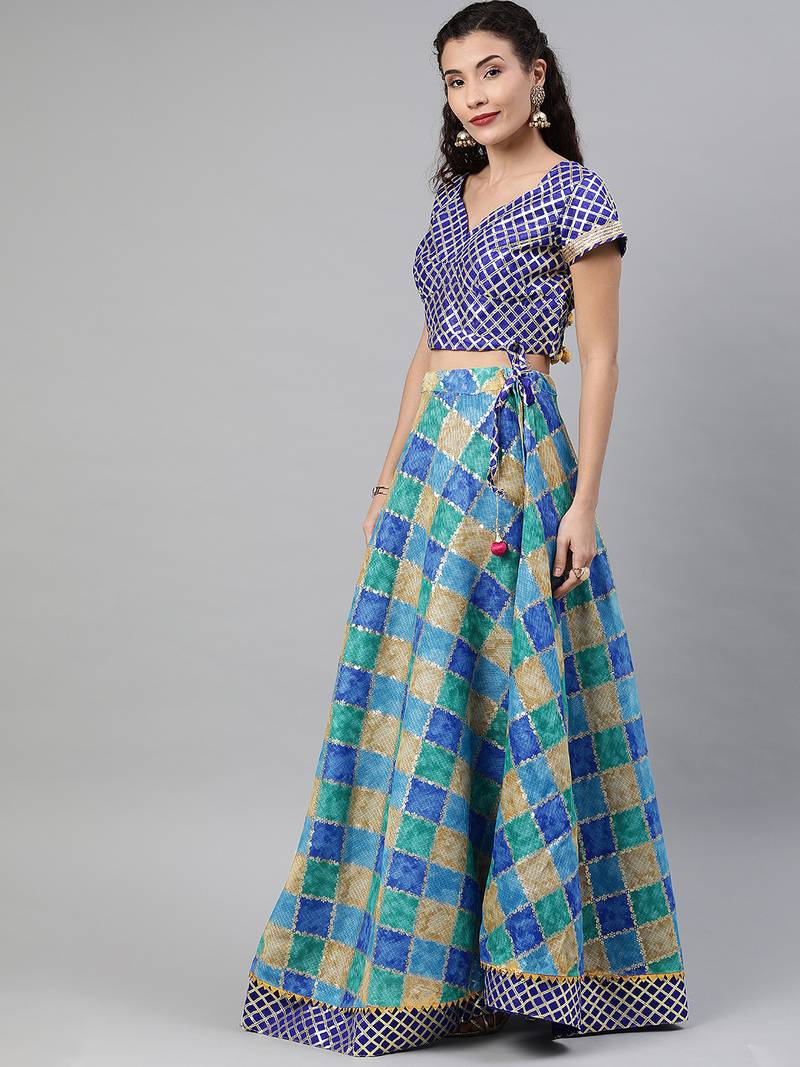 | Product Description | Blue Lehenga Choli Blue And Golden Woven Design Unstitched Blouse Piece Blue And Beige Checked Ready To Wear Lehenga, Flared Hem Blue And Beige Checked Dupatta, With Woven Design Border |