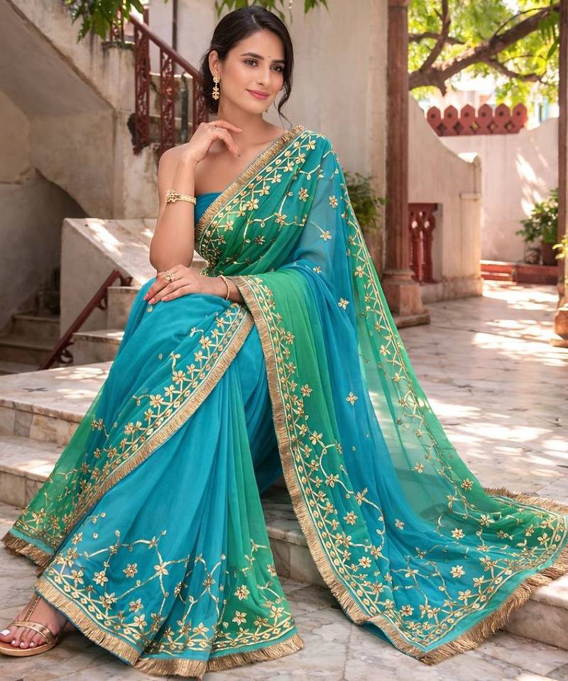 Green & blue shaded chiffon saree with gota patti jaal work