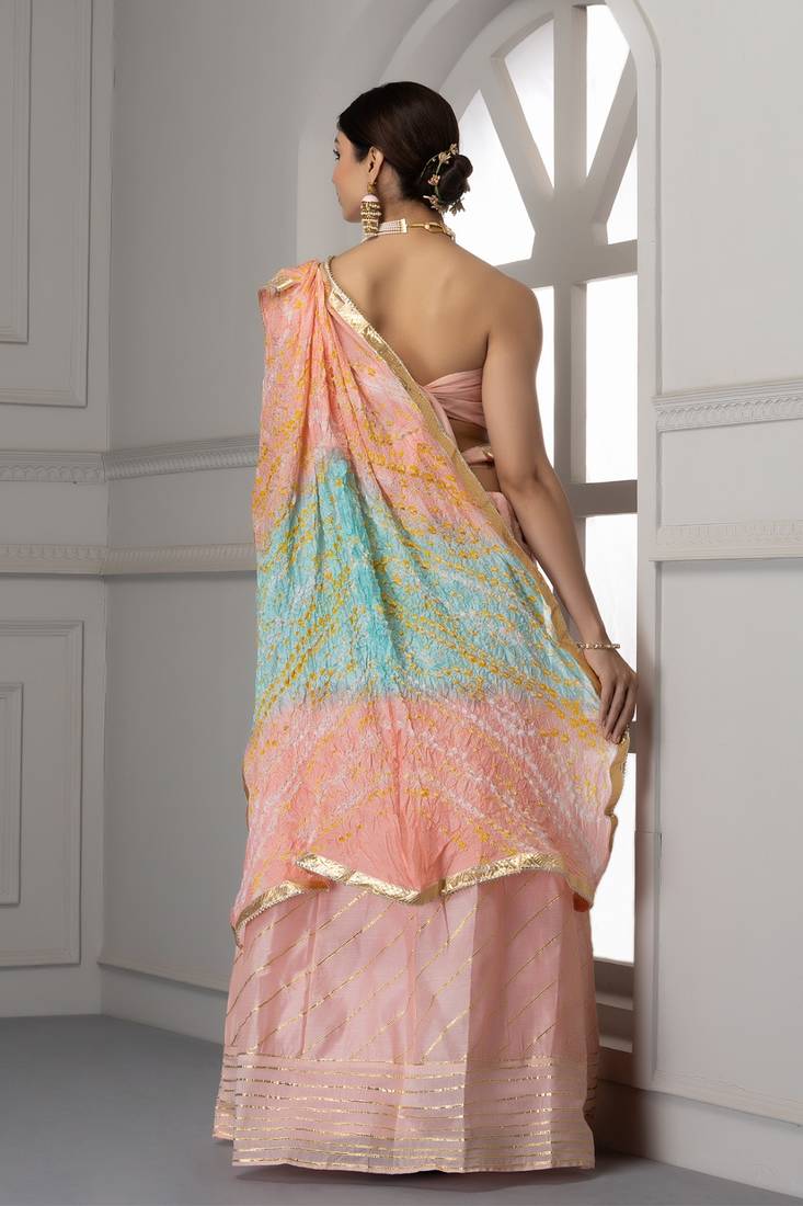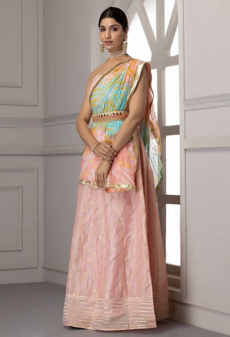 | Product Description | Peach Blue Lehenga Set Crafted In Silk Fabric With A Hand Woven Finish And Detailed Gota Work. Designed In An A Line Style, The Lehenga Offers A Structured And Balanced Silhouette Suitable For Wedding Occasions. It Is Paired With An Unstitched Silk Blouse, Allowing Flexible Customization In Fit And Design. The Sleeveless Choli Features A U Neck Style For A Clean Neckline. A Multicolor Silk Dupatta With Bandhej Work Completes The Set, Adding Visual Contrast. The Lehenga Includes Cotton Lining For Comfort, While The Overall Construction Maintains A Consistent Drape And Defined Appearance Throughout The Outfit. |