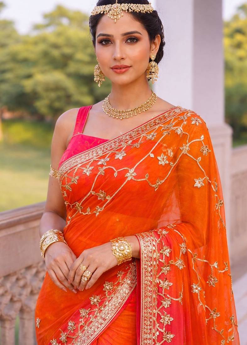 | Product Description | This Elegant Poly Chiffon Saree Features A Vibrant Pink And Orange Shaded Design Enhanced With Traditional Gota Patti Jaal Work. The Lightweight Fabric Offers A Soft And Graceful Drape, Making It Ideal For Festive Occasions And Celebrations. The Saree Comes With A Matching Unstitched Blouse Piece, Allowing You To Customize The Blouse As Per Your Style. |