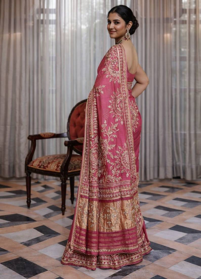 | Product Name | Pink Silk Saree With Gota Patti Jaal Work, Peacock Motifs & Heavy Pallu | |