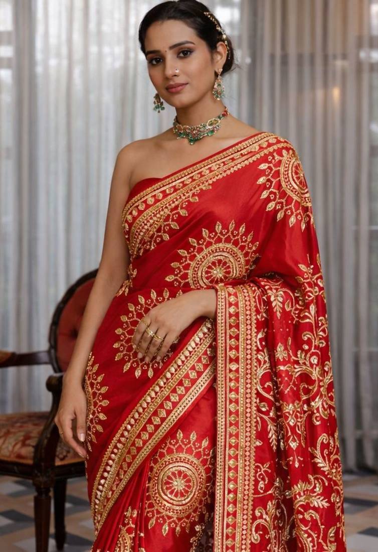 | Product Description | Make A Striking Statement With This Red Silk Saree Featuring Intricate Gota Patti Jaal Work And Beautifully Crafted Peacock Motifs On The Pallu. The Heavy Embellished Pallu Adds A Rich And Regal Touch, Making It Perfect For Weddings, Festive Occasions, And Traditional Celebrations. The Saree Comes With A Matching Unstitched Blouse Piece For Customized Stitching And Styling. |