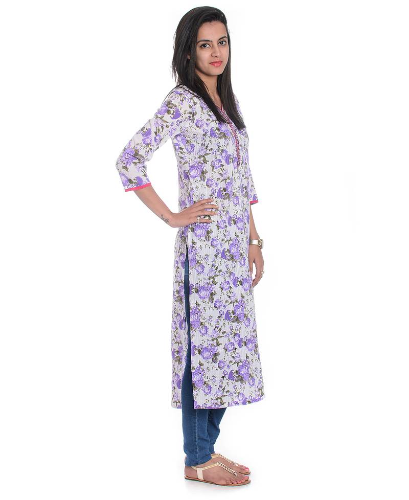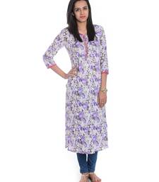 white & purple floral printed cotton straight kurta