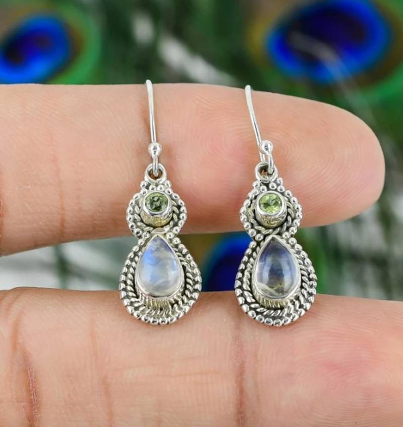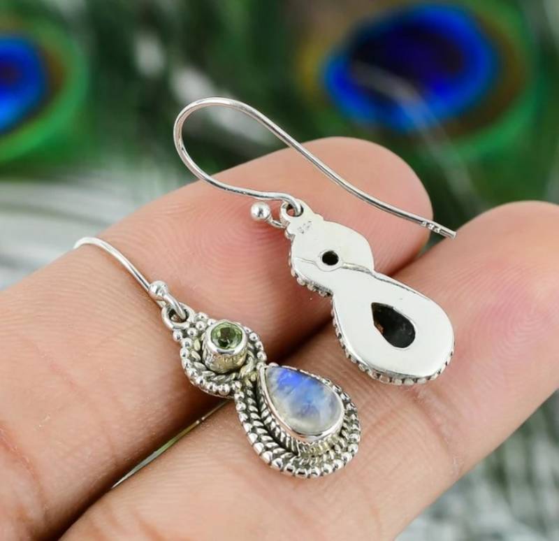 | Product Description | Features: Gemstones: Natural Green Peridot & Rainbow Moonstone Metal: 925 Sterling Silver Style: Hook / Drop Earrings Birthstones: August (Peridot) & June (Moonstone) Finish: High Polish, Artisan Handmade Nickel Free & Hypoallergenic Lightweight & Comfortable For All Day Wear |