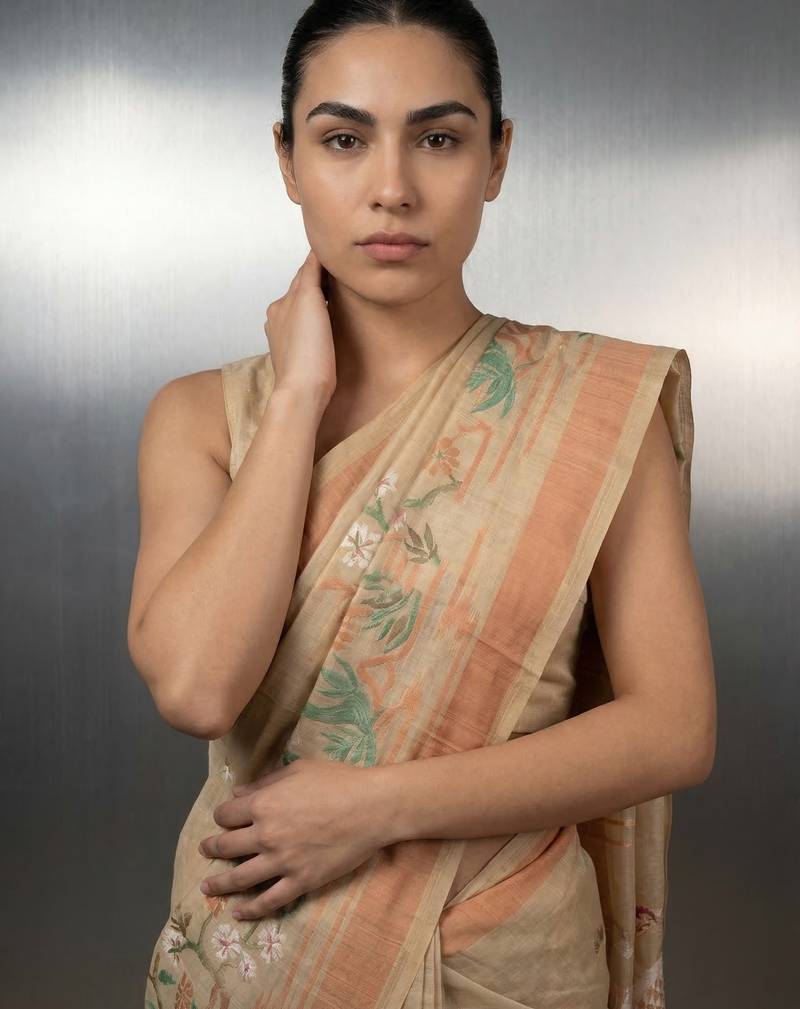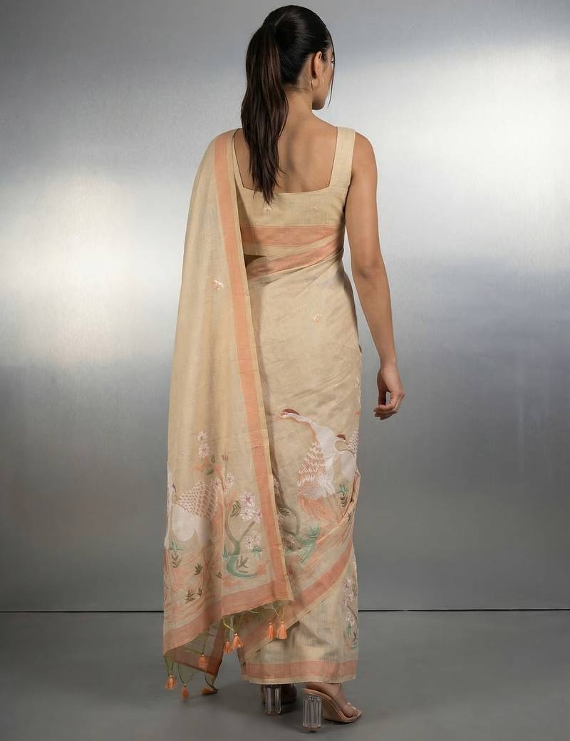 | Product Description | This Elegant Saree Is Crafted From Premium Linen Silk Fabric, Offering A Soft Texture With A Natural Sheen And Comfortable Drape. It Features Subtle Thread Embroidery With Delicate Motifs Across The Body, Complemented By A Graceful Peach Toned Border. The Pallu Is Beautifully Adorned With Artistic Floral And Bird Inspired Designs, Adding A Unique And Sophisticated Touch. Perfect For Office Wear, Casual Gatherings, And Daytime Occasions, This Saree Blends Simplicity With Elegance. Paired With A Matching Blouse Piece, It Creates A Refined And Classy Ethnic Look. |