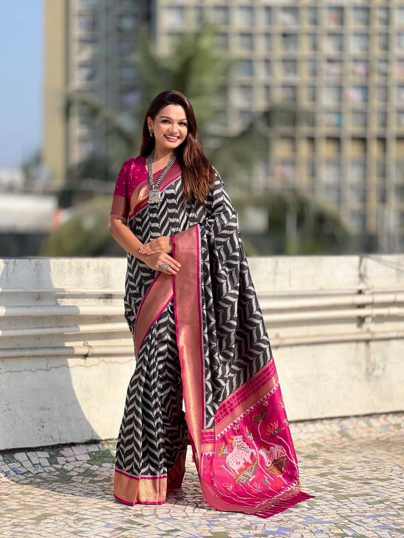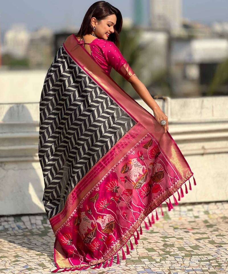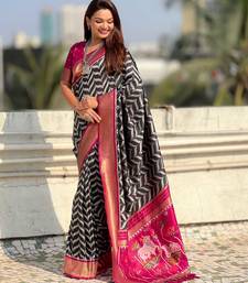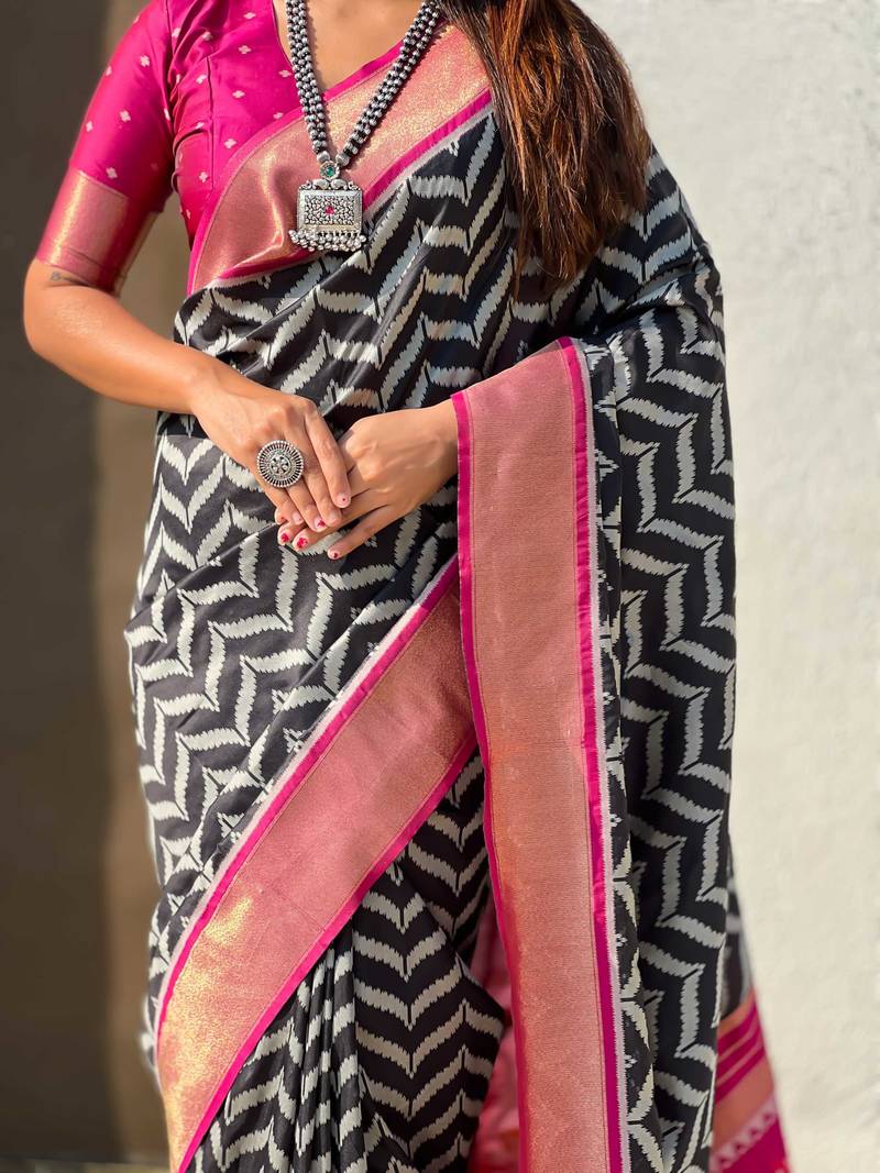 Black contrast woven ikat pattern with zari pallu work silk blend