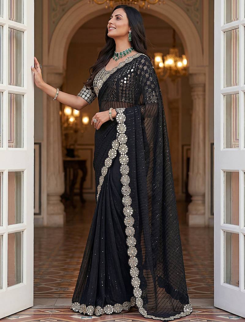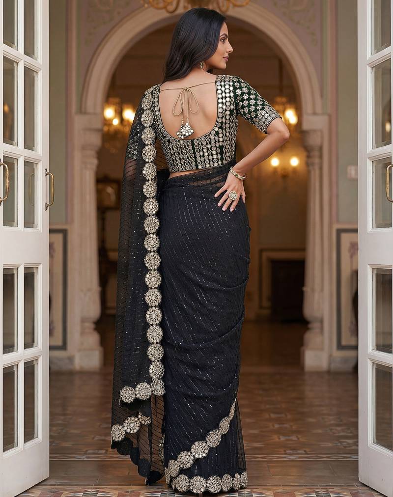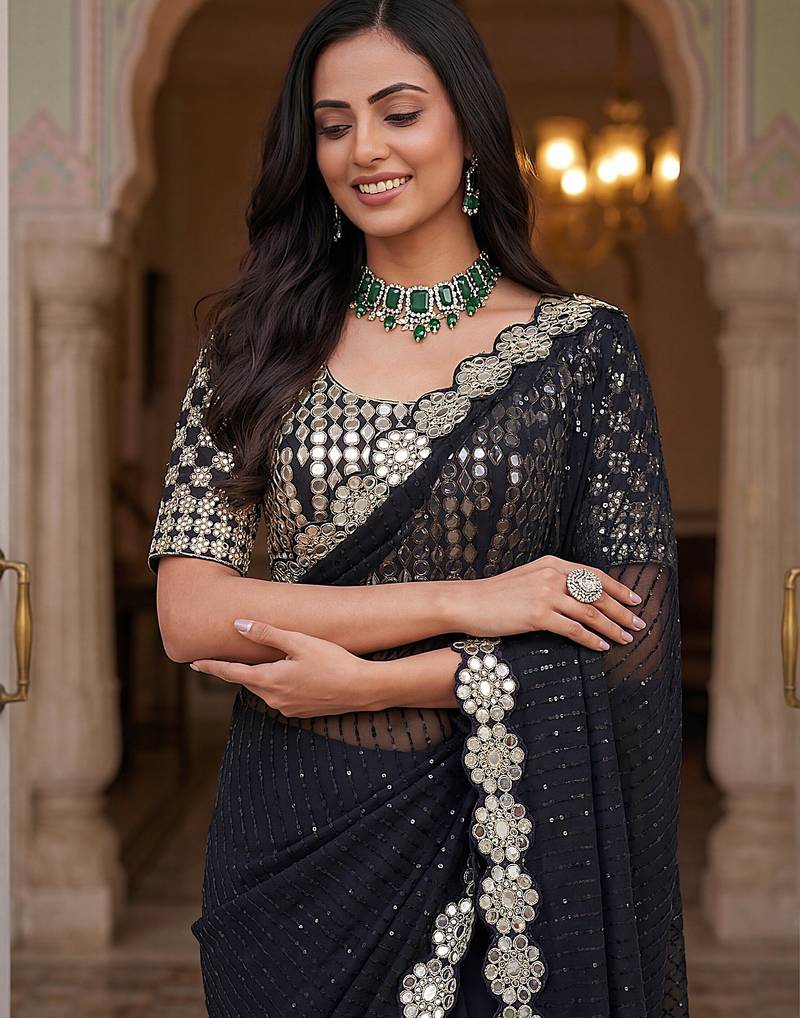 Black faux georgette embroiderd sequence work saree with matching blouse piece