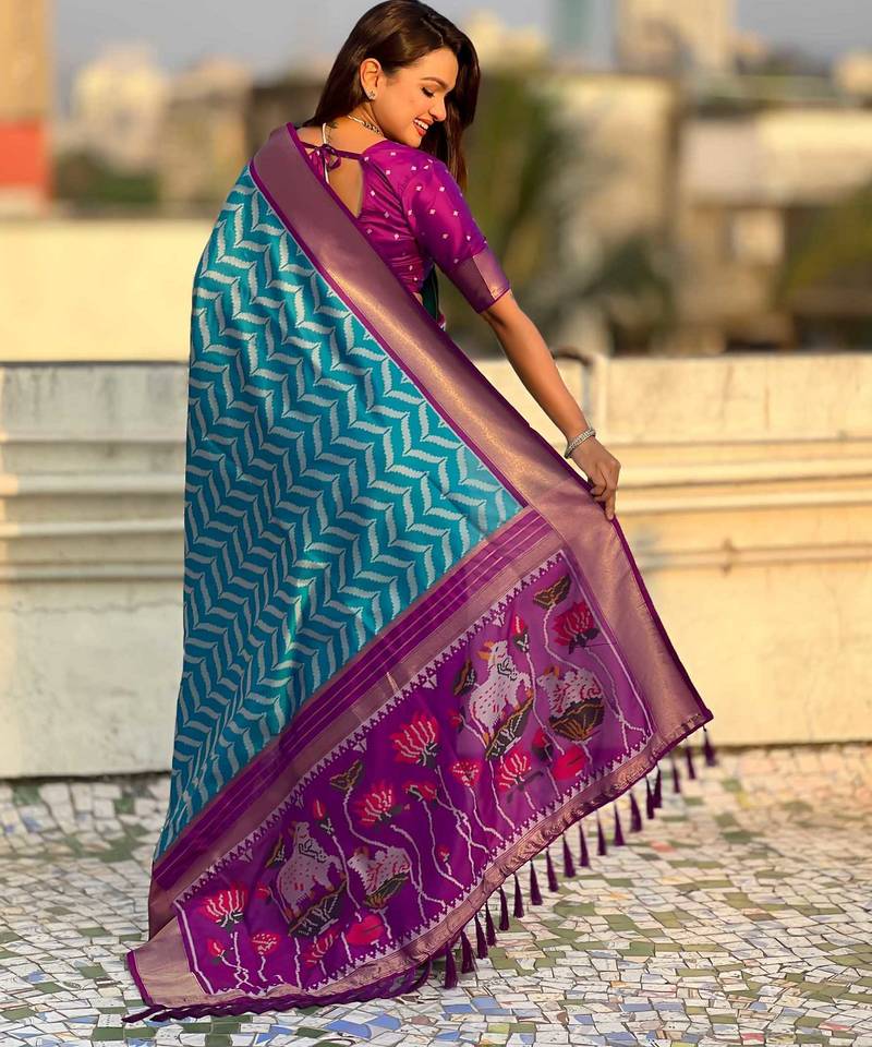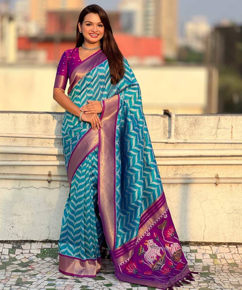 Blue contrast woven ikat patblrn with zari pallu work silk blend