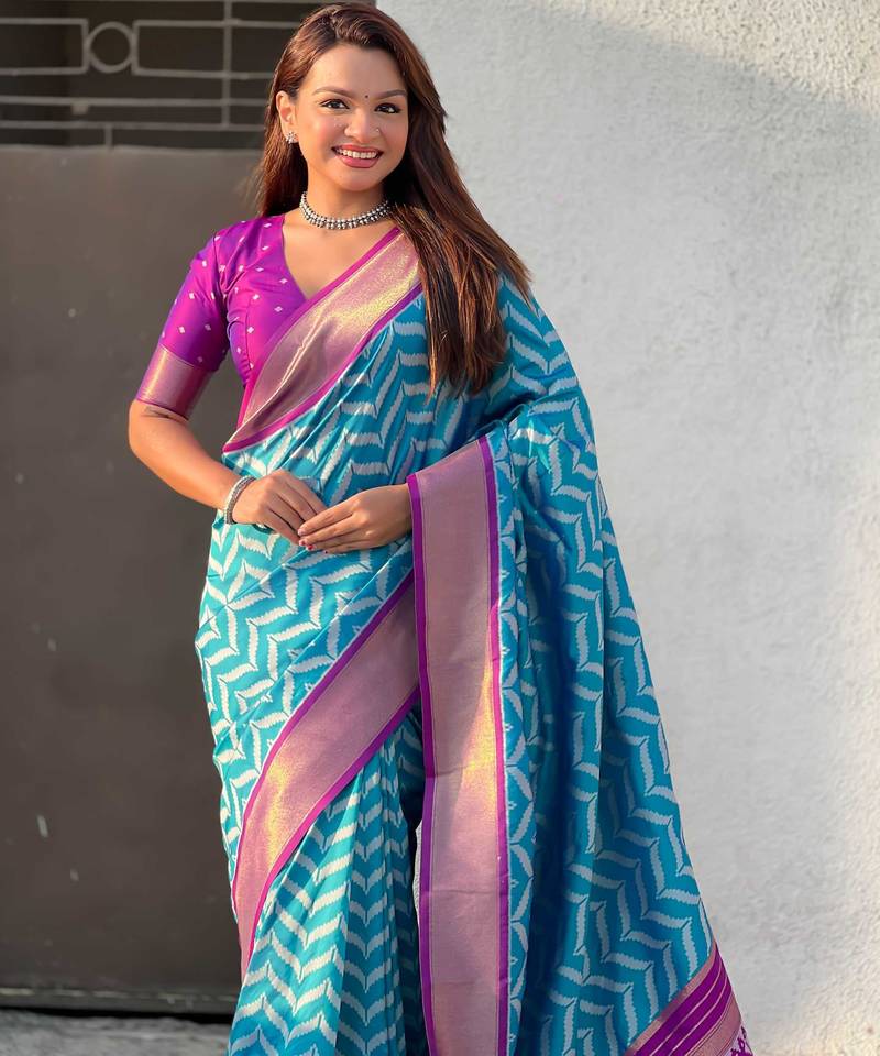 | Product Name | Blue Contrast Woven Ikat Patblrn With Zari Pallu Work Silk Blend | |