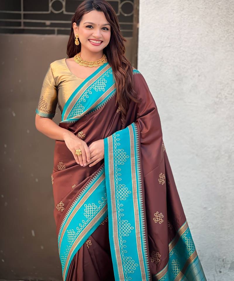Chocolate border traditional butti & geometric zari work rich woven pallu design