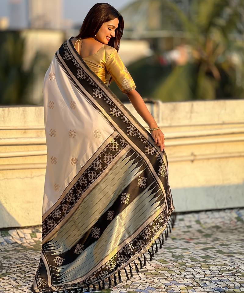 Cream border traditional butti & geometric zari work rich woven pallu design