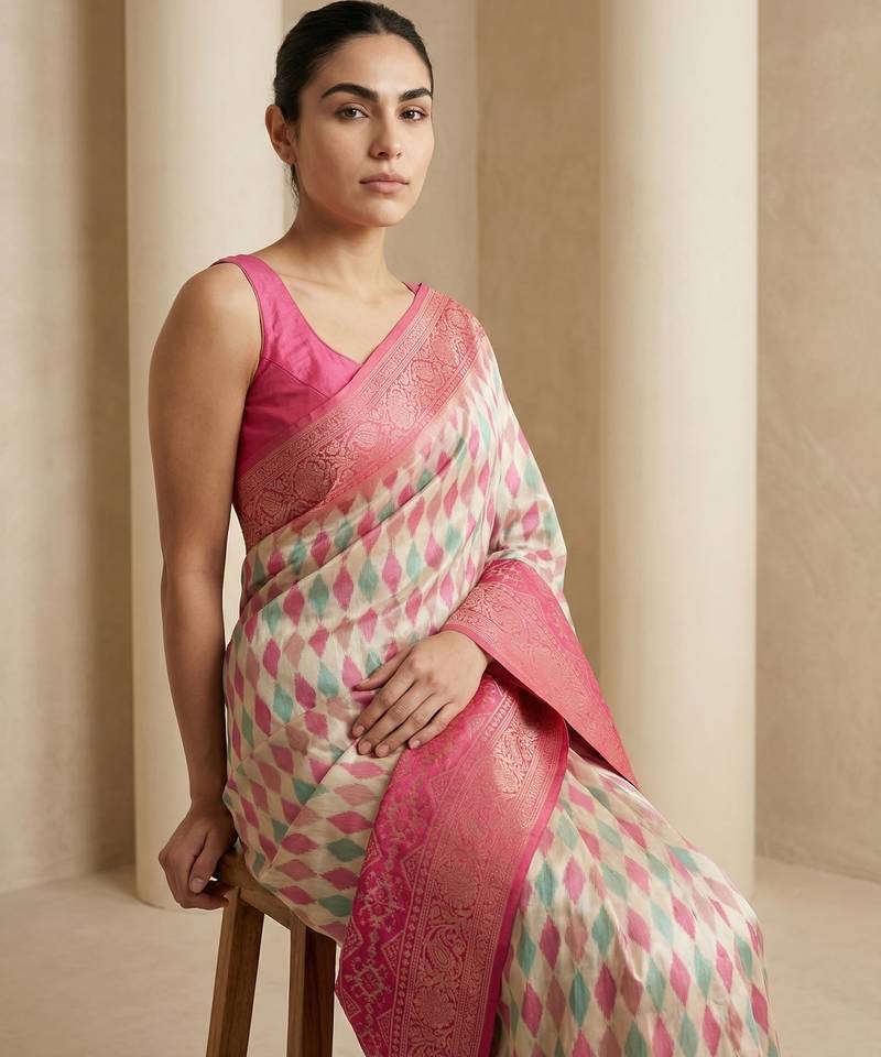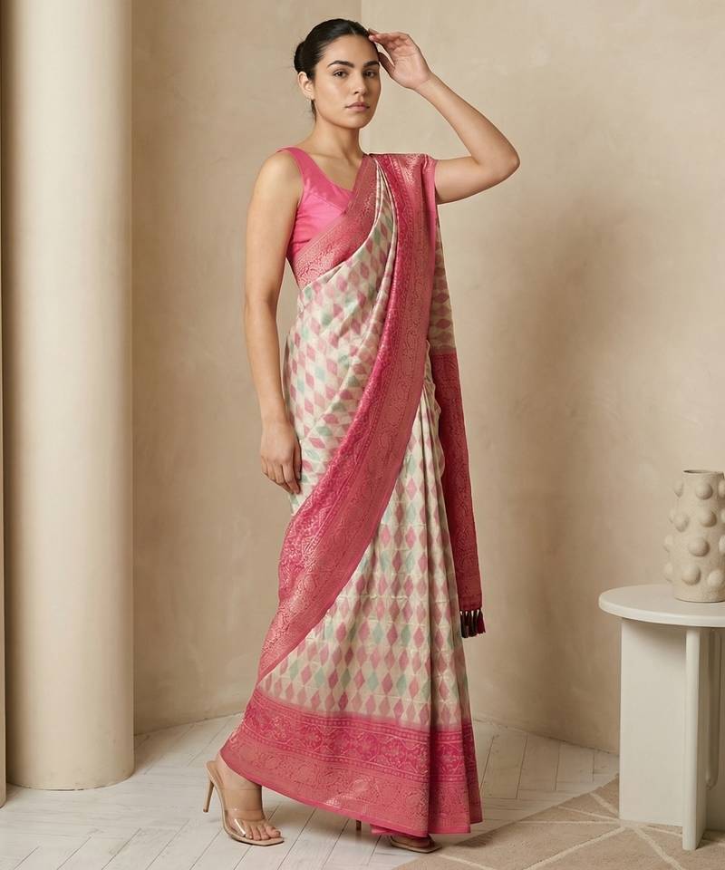 Cream geometric diamond weave pattern rich zari woven border & pallu silk blend fabric
