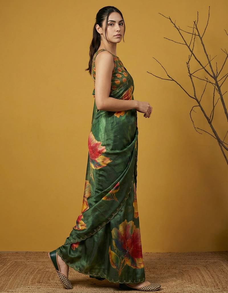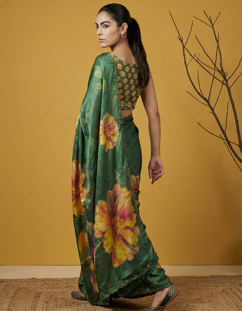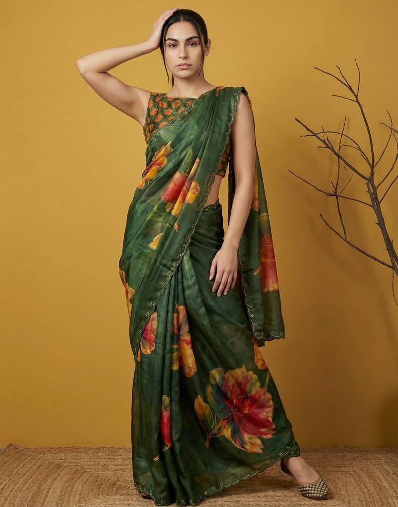 | Product Description | This Elegant Saree Is Crafted From Lightweight Organza Fabric, Offering A Sheer Texture With A Smooth And Graceful Drape. It Features Bold Multicolor Floral Digital Prints Across The Saree, Creating A Striking And Artistic Appeal. The Subtle Embroidered Border Adds A Refined Touch, Enhancing Its Overall Sophistication. Perfect For Evening Parties, Festive Occasions, And Special Events, This Saree Blends Modern Style With Ethnic Charm. Paired With A Matching Blouse Piece, It Creates A Stylish And Eye Catching Traditional Ensemble. |
