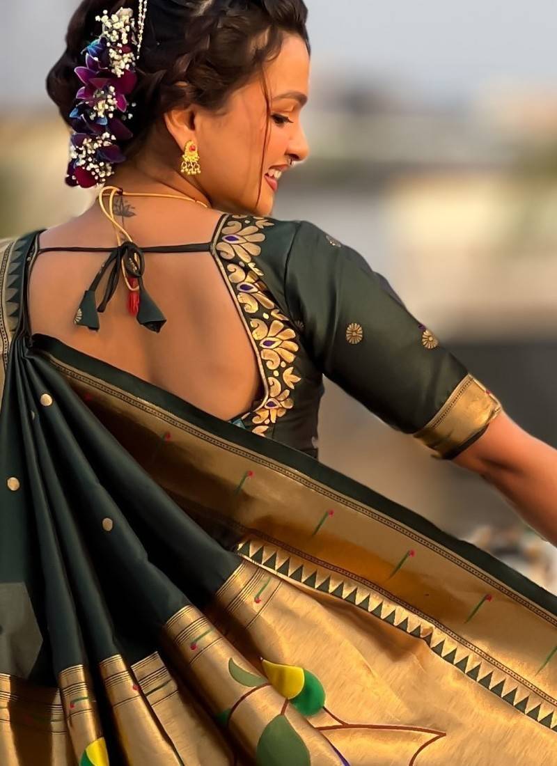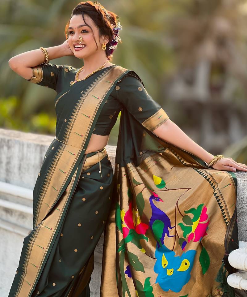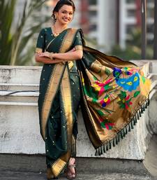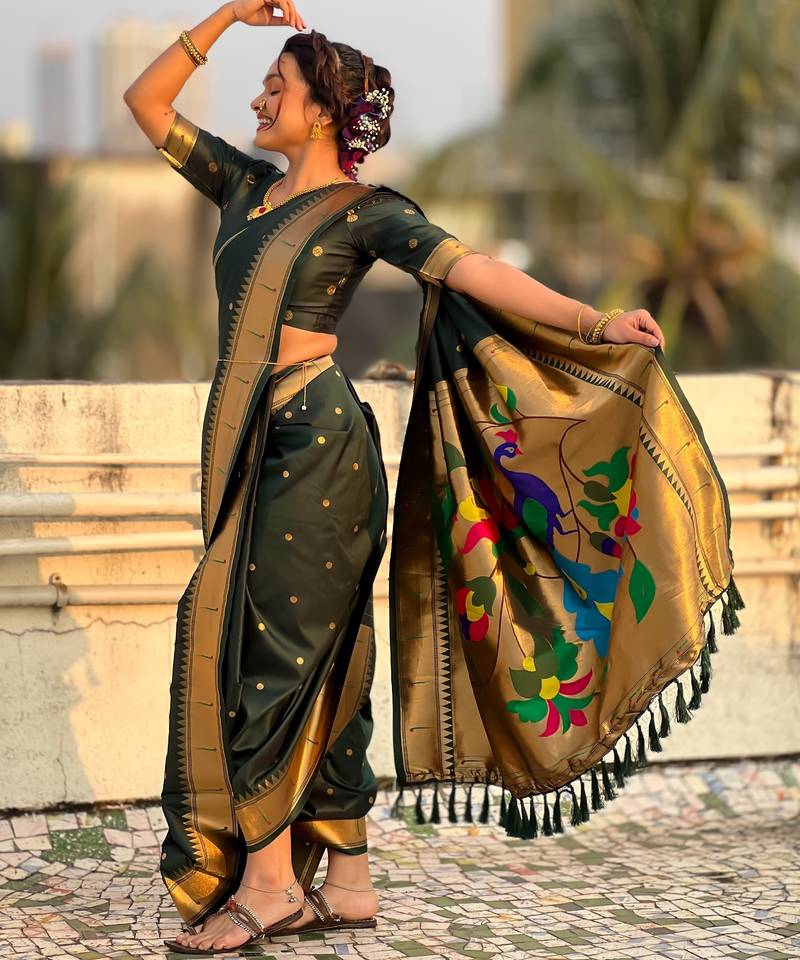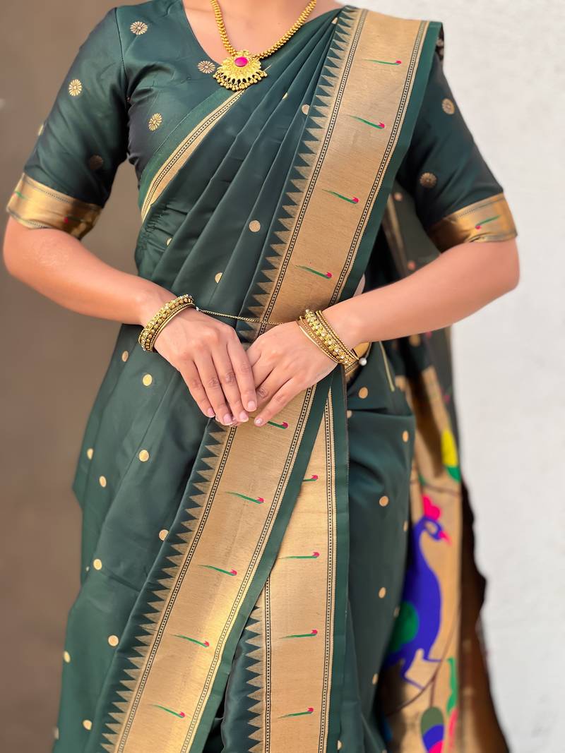 Green soft silk paithani nauvari zari weaving saree with matching blouse piece